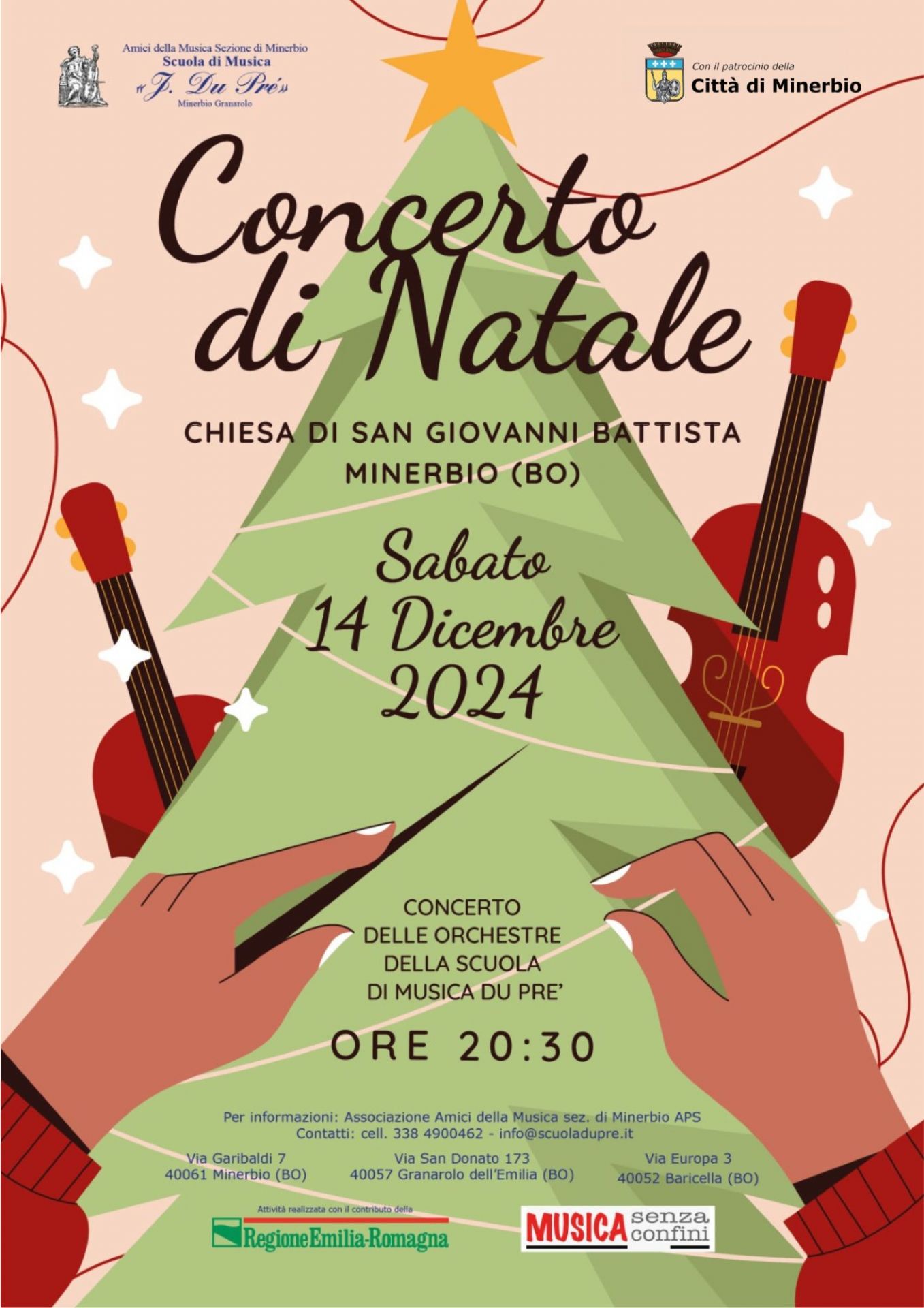 Sabato 14 dicembre 2024 alle ore 20.30 nella Chiesa parrocchiale San Giovanni Battista di Minerbio, in via G. Garibaldi 7/a, con il patrocinio del Comune di Minerbio, si terrà il Concerto di Natale della Scuola di Musica J. Du Pré.