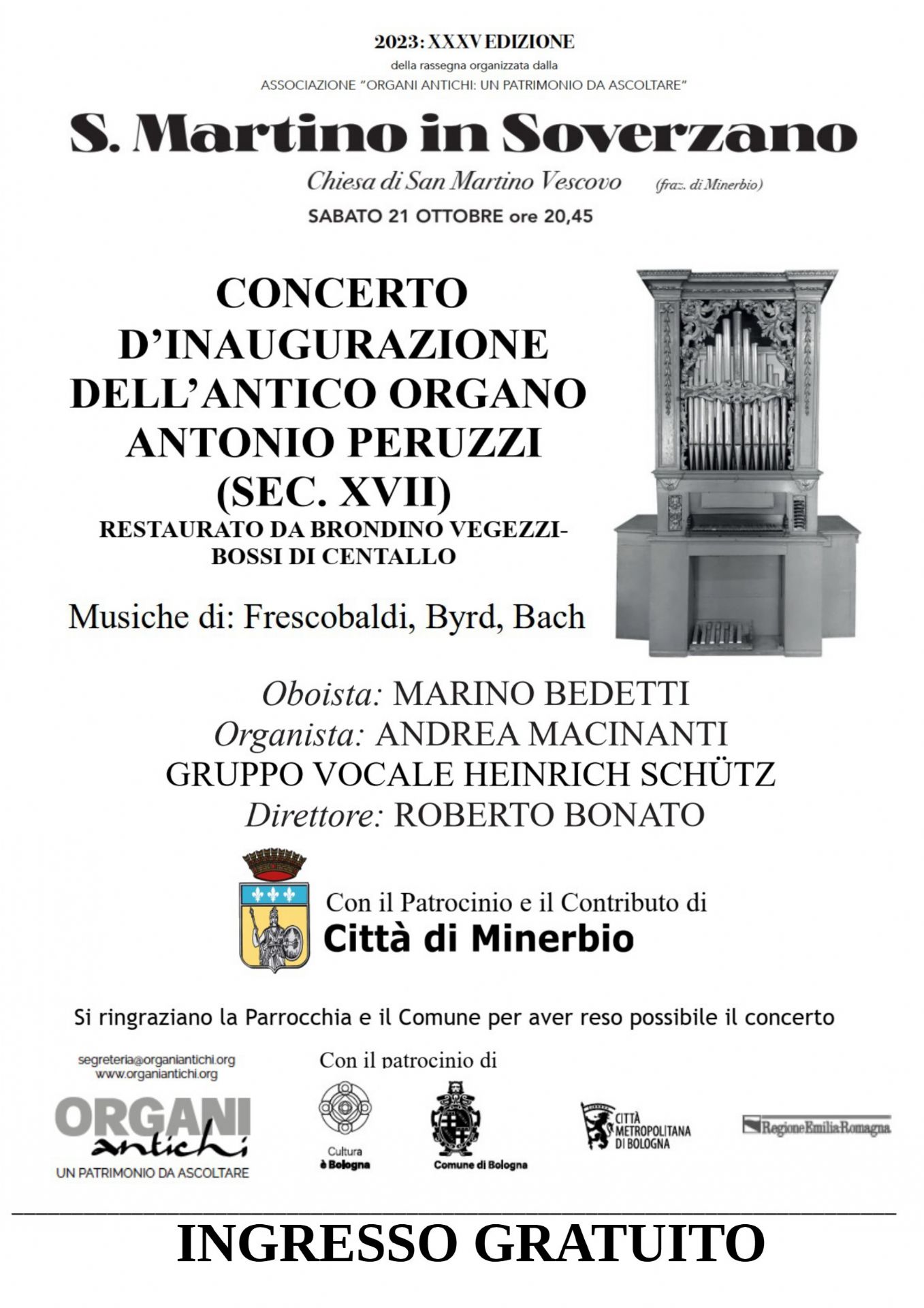 Sabato 21 ottobre 2023 alle ore 20.45 si terrà il concerto di inaugurazione dell'antico organo Antonio Peruzzi (sec. XVII) restaurato da Brondino Vegezzi-Bossi di Centallo presso la Chiesa di San Martino Vescovo a San Martino in Soverzano all'interno della XXXV edizione della rassegna organizzata dall'Associazione Organi Antichi: un patrimonio da ascoltare