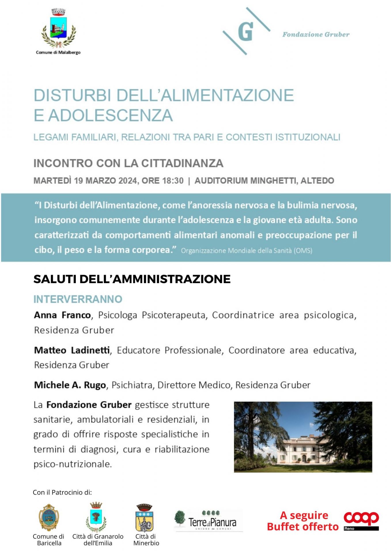 Incontro Martedì 19 marzo ore 18:30 in Auditorium Minghetti per il convegno sui disturbi dell'alimentazione e adolescenza come da volantino in allegato.