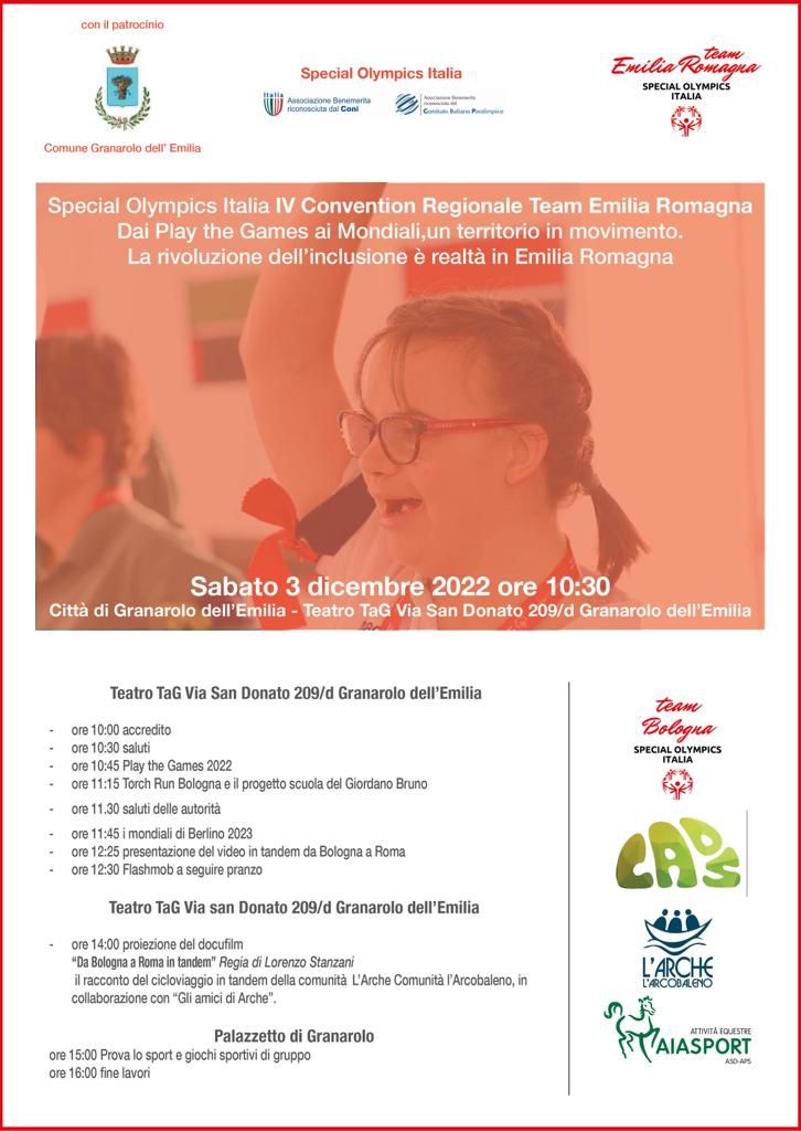 Sabato 3 dicembre, alle ore 10.30, si tiene al TaG - Teatro a Granarolo (via San Donato 209/d) si tiene la quarta Convention regionale Team Emilia Romagna di Special Olympics Italia. Il tema dell'incontro, che si svolge nella Giornata internazionale delle persone con disabilità, avrà come tema central "Dai Play the Games ai Mondiali, un territorio in movimento. La rivoluzione dell'inclusione è realtà in Emilia Romagna".