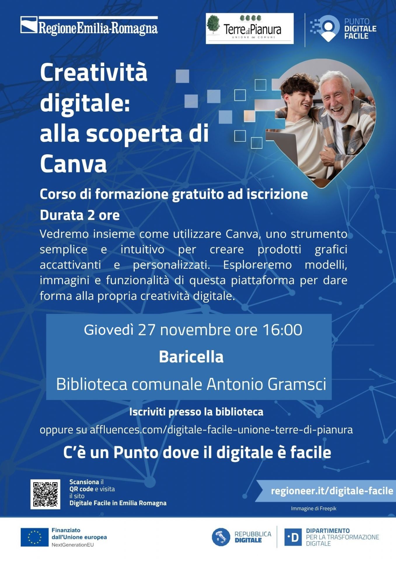 Partecipa al Corso Gratuito di Formazione dedicato a Canva, che si terrà giovedì 27 novembre alle ore 16:00, presso la Biblioteca A. Gramsci di Baricella.