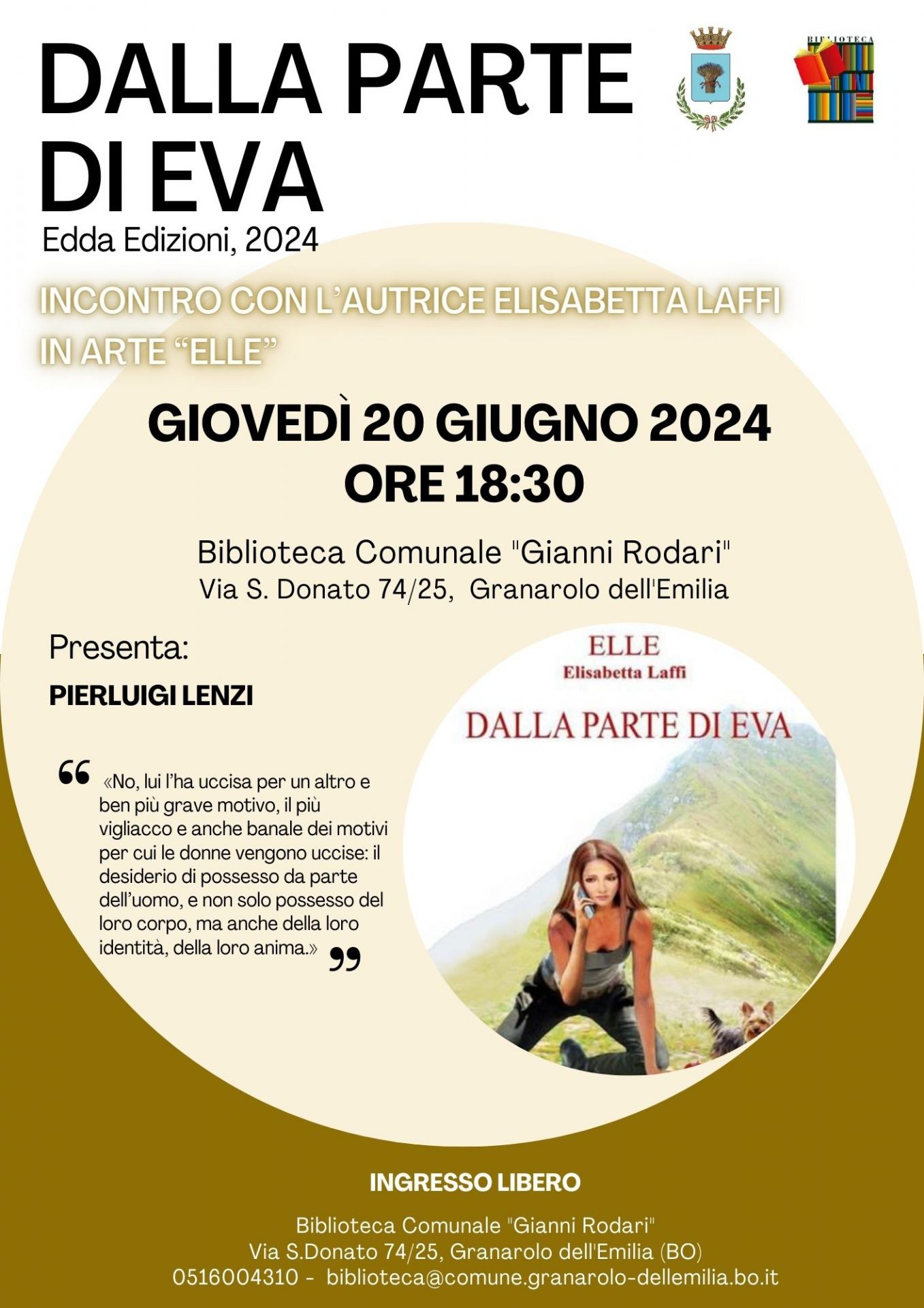 Presentazione in biblioteca comunale "Rodari", giovedì 20 giugno alle ore 18.30, del libro "Dalla parte di Eva" (Edda Edizioni) di Elisabetta Laf, in arte "Elle". Presenterà l'autrice Pierluigi Lenzi. Ingresso libero.
