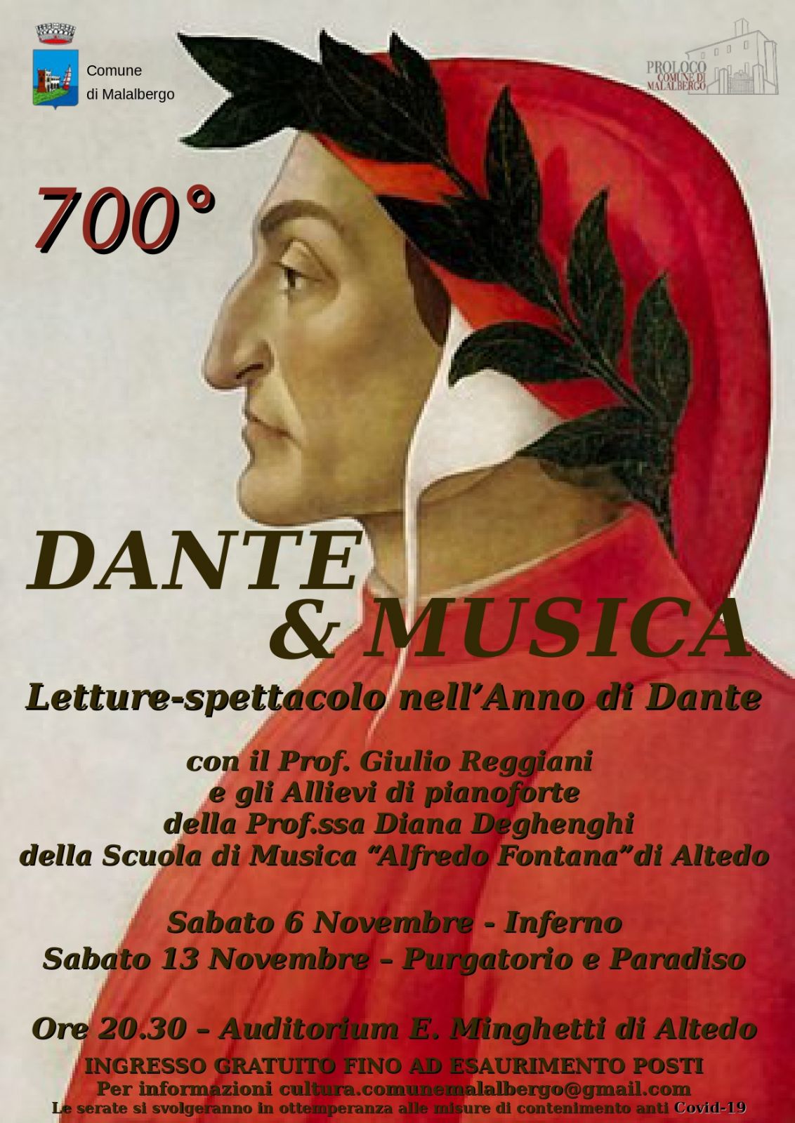 Sabato 6 e sabato 13 novembre alle ore 20.30 all'Auditorium Minghetti di Altedo due letture-spettacolo nell'anno di Dante con il Prof. Giulio Reggiani e gli Allievi di pianoforte della Prof.ssa Diana Deghenghi della Scuola di Musica "Alfredo Fontana" di Altedo.