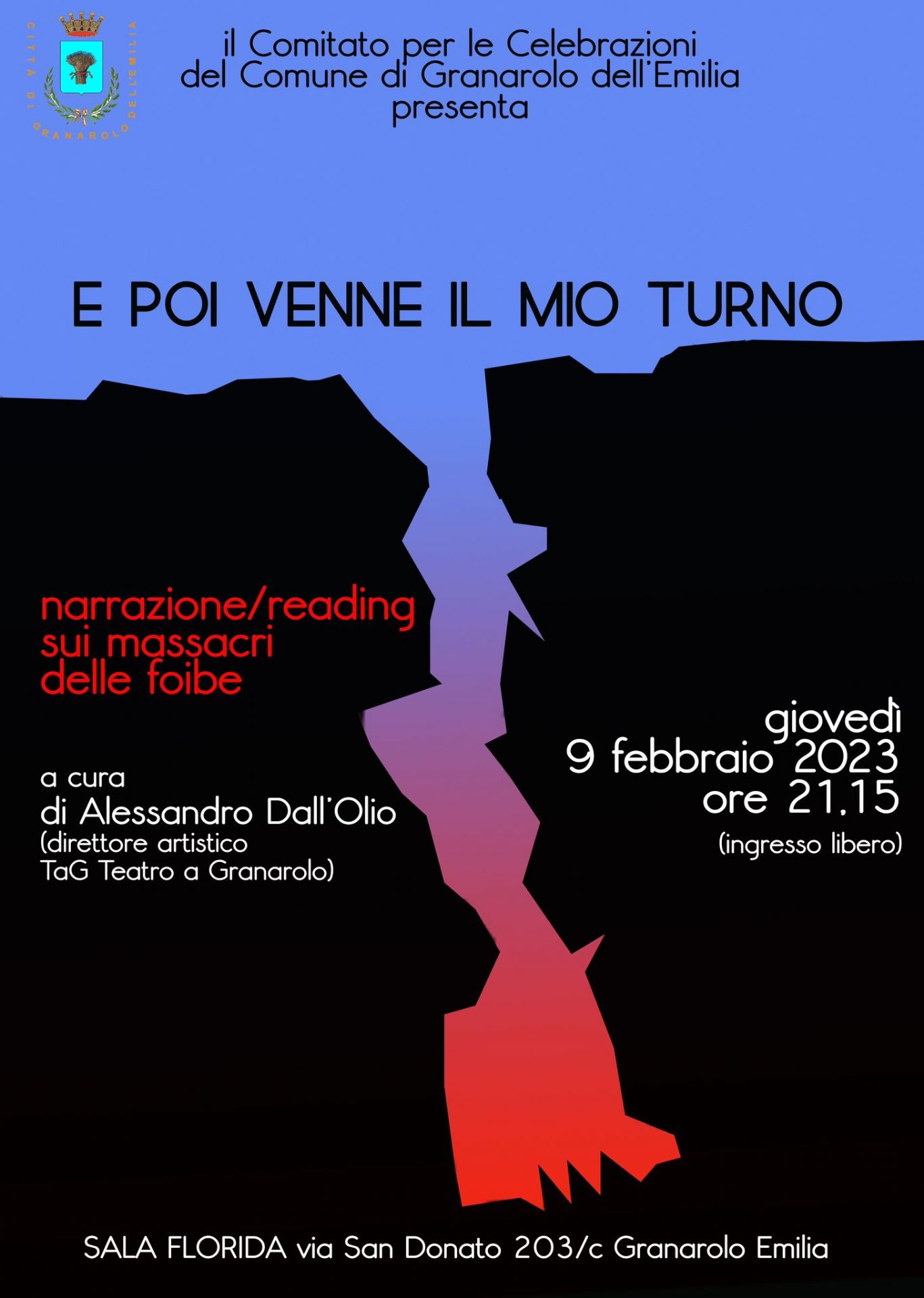 In occasione del Giorno del Ricordo, che si celebra ogni anno a livello nazionale il 10 febbraio per ricordare i massacri delle foibe e l'esodo giuliano dalmata, il Comitato per le Celebrazioni del Comune di Granarolo dell'Emilia presenta il reading/narrazione "E poi venne il mio turno".