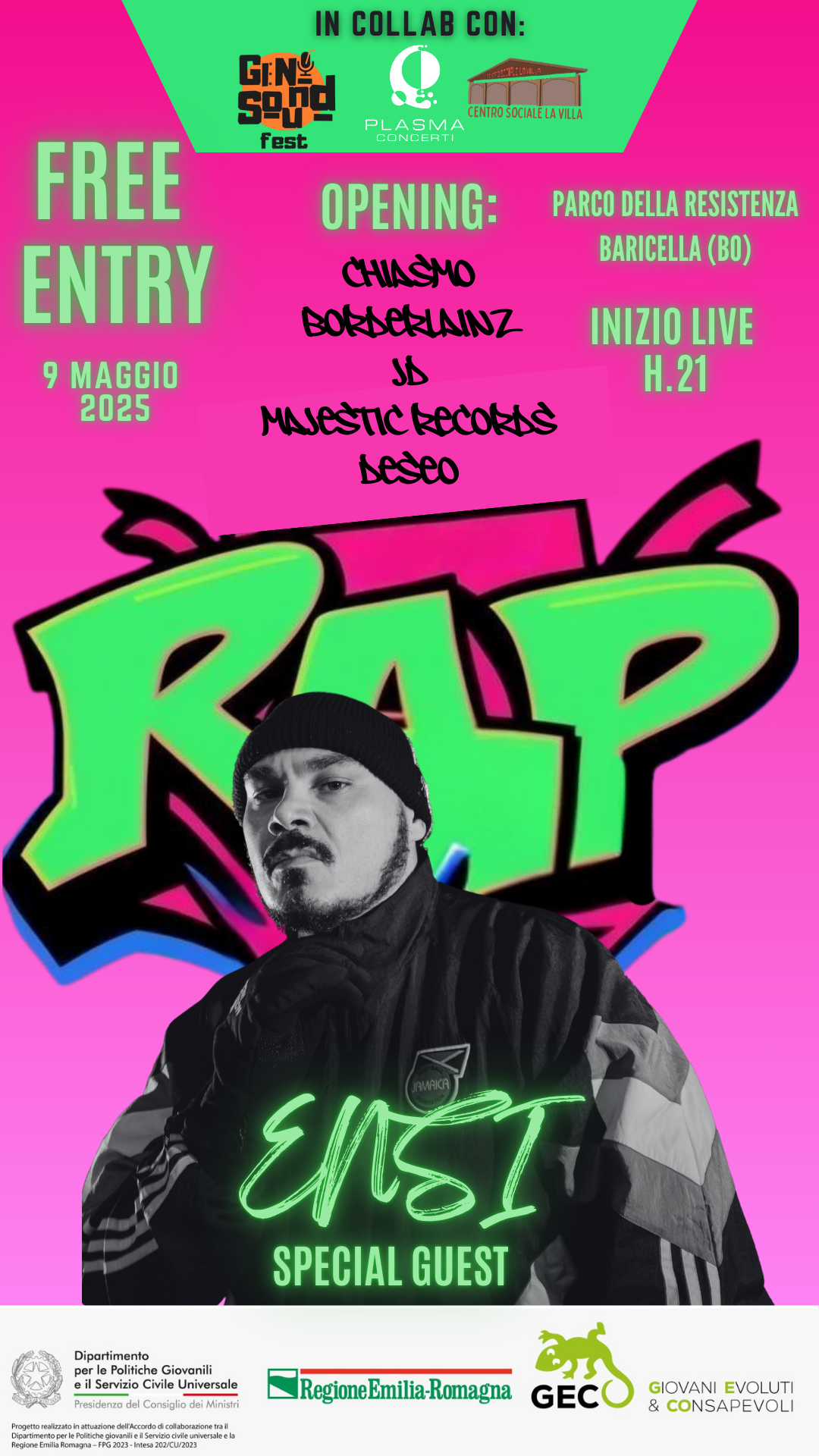 Venerdì 9 Maggio prende il via al Parco della Resistenza il Gen Sound Fest, che inaugura con una serata tutta dedicata al rap. Protagonista assoluto della serata è ENSI, uno dei nomi più influenti del panorama hip hop italiano.