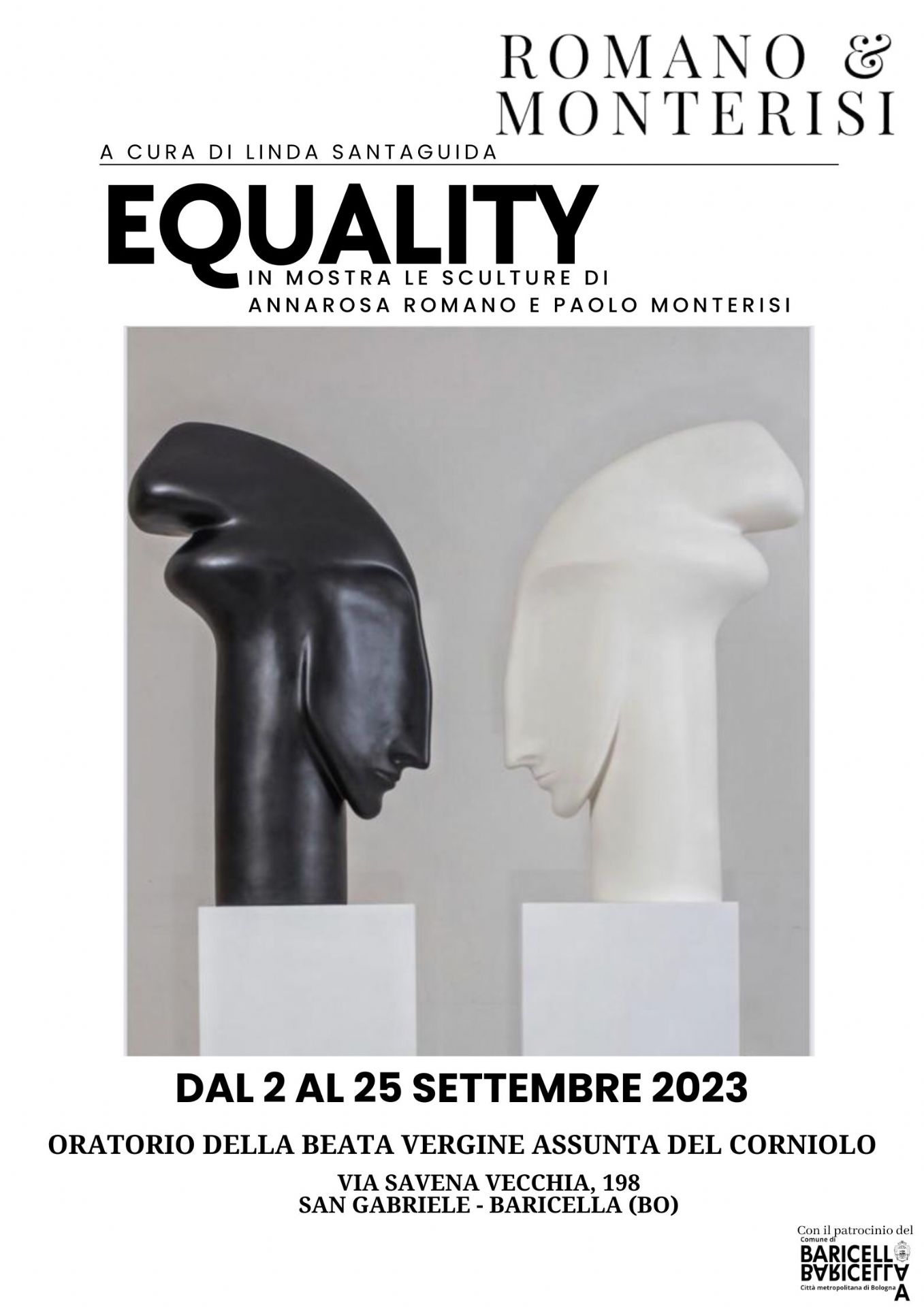 Le sculture di Annarosa Romano e Paolo Monterisi saranno in mostra presso l'Oratorio della Beata Vergine Assunta del Corniolo di S. Gabriele (Baricella) fino al 25 Settembre 2023.