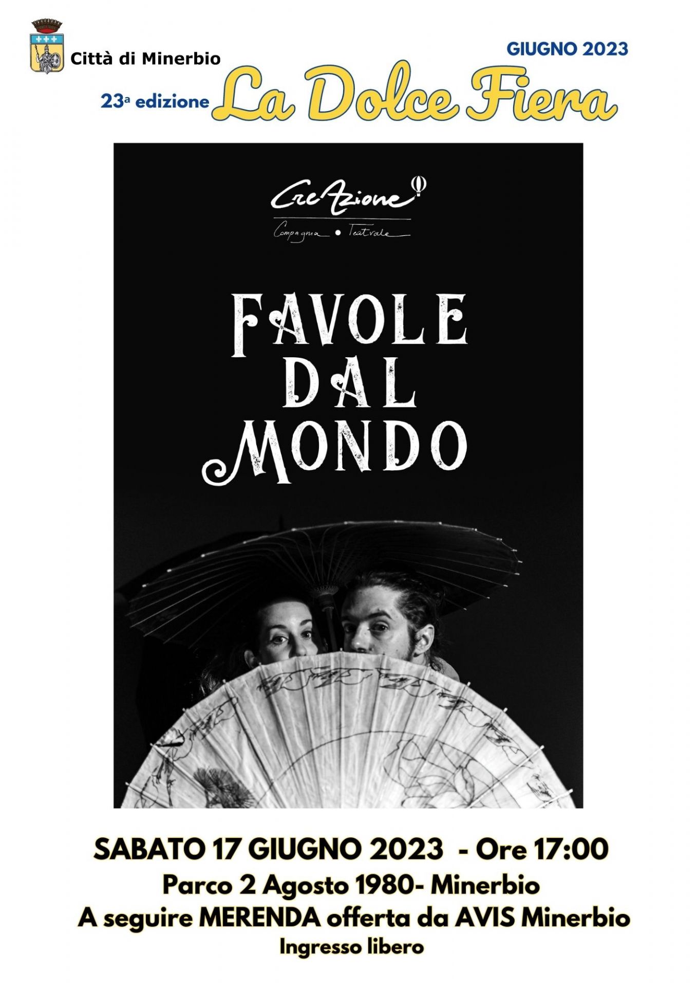 In occasione della 23° Dolce Fiera, sabato 17 giugno 2023 alle ore 17.00 presso il Parco 2 agosto 1980, spettacolo teatrale per bambini di e con CreAzione Aps: FAVOLE DAL MONDO.