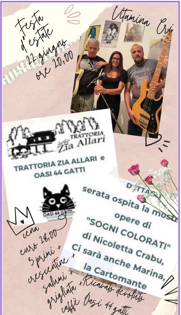 L'Oasi Felina 44 gatti organizza il 22 giugno una festa d'estate per raccogliere fondi per la propria attività. L'appuntamento è dalle ore 20 con una cena a menù fisso (28 euro) presso la Trattoria da Zia Allari. La serata sarà accompagnata dalla musica di "Vitamina Cri". Sarà allestita anche la mostra "Sogni colorati", con opere di Nicoletta Crabu.
