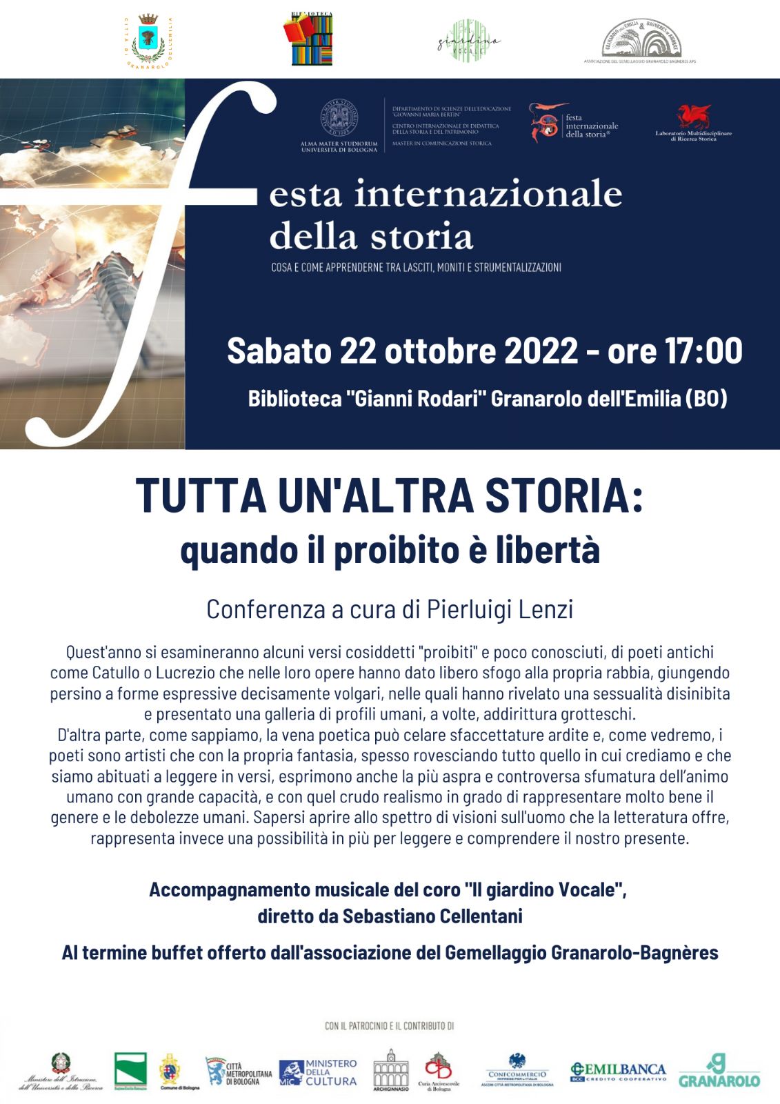 Anche quest’anno ritorna la Festa della Storia. Sabato 22 ottobre alle ore 17, presso la biblioteca comunale di Granarolo dell'Emilia, Pierluigi Lenzi esaminerà alcuni versi, cosiddetti "proibiti" e poco conosciuti, di poeti antichi come Catullo o Lucrezio che nelle loro opere hanno dato libero sfogo alla propria rabbia, giungendo persino a forme espressive decisamente volgari e rivelando una sessualità disinibita.