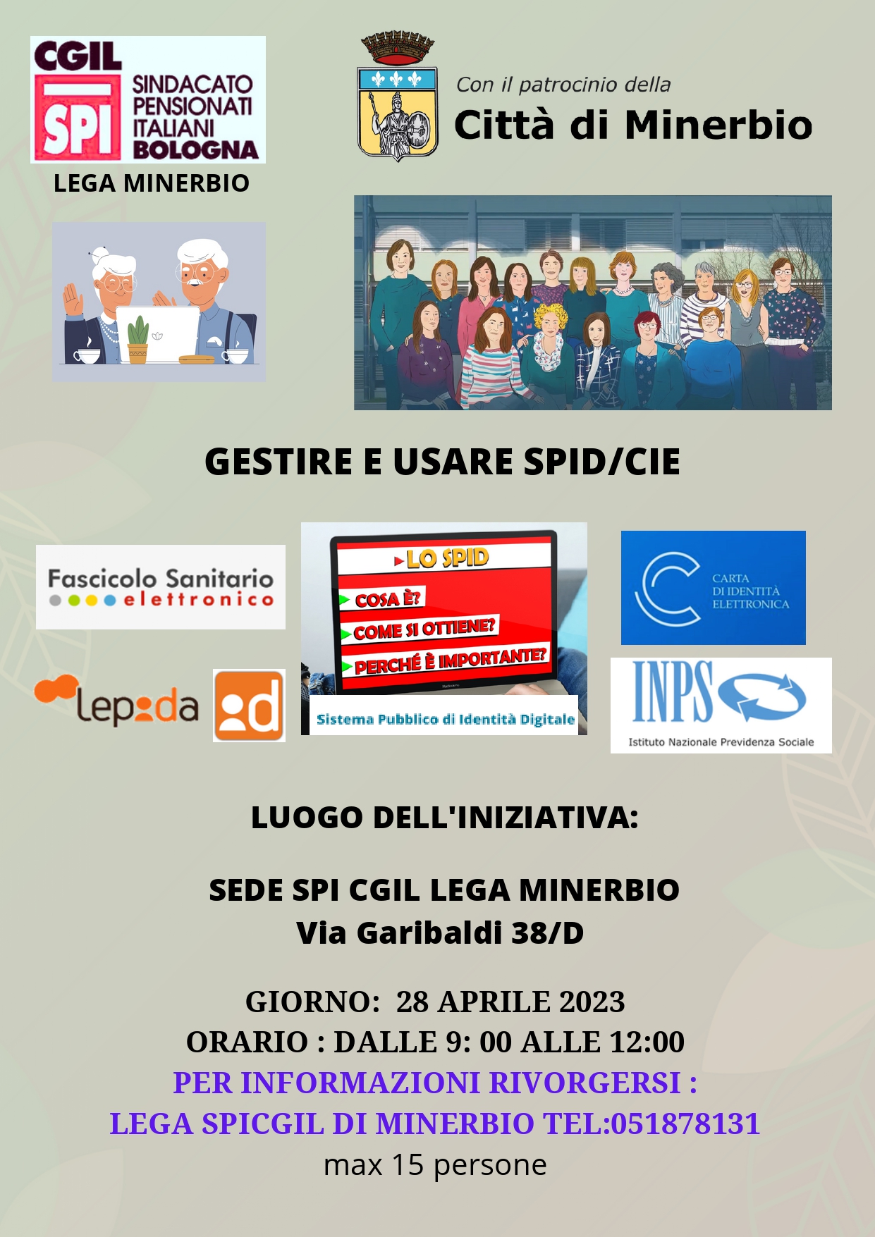 Venerdì 28 aprile dalle ore 9:00 alle ore 12:00 SPI CGIL Lega di Minerbio con il patrocinio della Città di Minerbio terrà l'incontro "Gestire e usare SPID/CIE" presso la sede SPI CGIL Lega di Minerbio di Via Garibaldi 38/D.