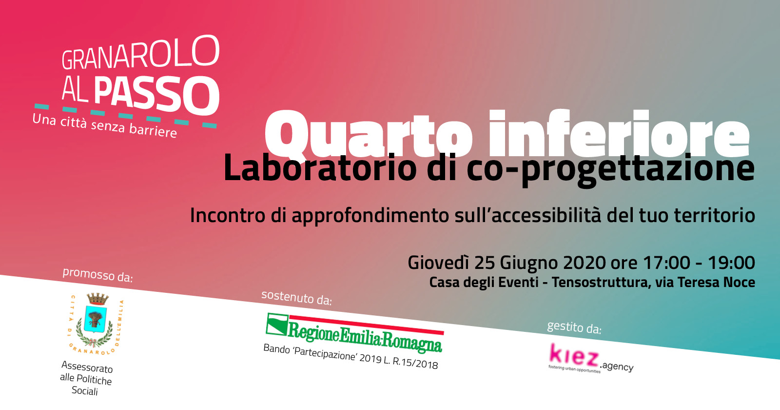 Giovedì 25 Giugno, dalle 17 alle 19 presso la "Casa degli Eventi" (tensostruttura) in via Teresa Noce a Quarto Inferiore, si terrà il laboratorio di co-progettazione sulla frazione di Cadriano.