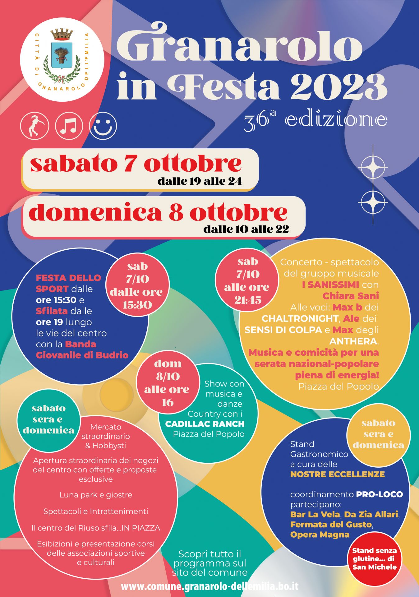 Tornano i colori, la musica, i profumi e i sapori, il divertimento del nostro appuntamento tradizionale di inizio ottobre. “Granarolo in Festa” 2023 proporrà un fine settimana, sabato 7 e domenica 8 ottobre, pienissimo di eventi nel centro del capoluogo. Due giorni da gustare tutti d’un fiato tra cibo, danze, sport, cultura, giochi: come sempre con l’organizzazione del Comune in collaborazione con la Pro-Loco e con tantissime associazioni del territorio che saranno protagoniste con le loro attività e proposte.