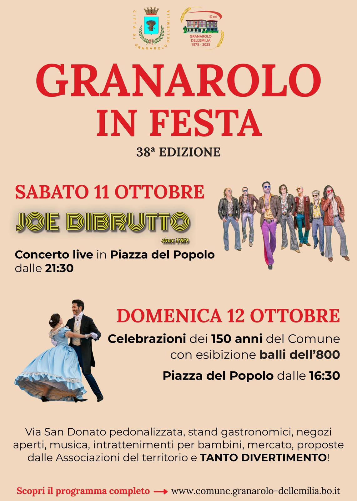 SPETTACOLO alle ore 21.30 in piazza del Popolo con il coinvolgente concerto dei JOE DI BRUTTO, la famosissima band bolognese che da 35 anni ci fa ballare tra discomusic e funk in un live travolgente e ineguagliabile.