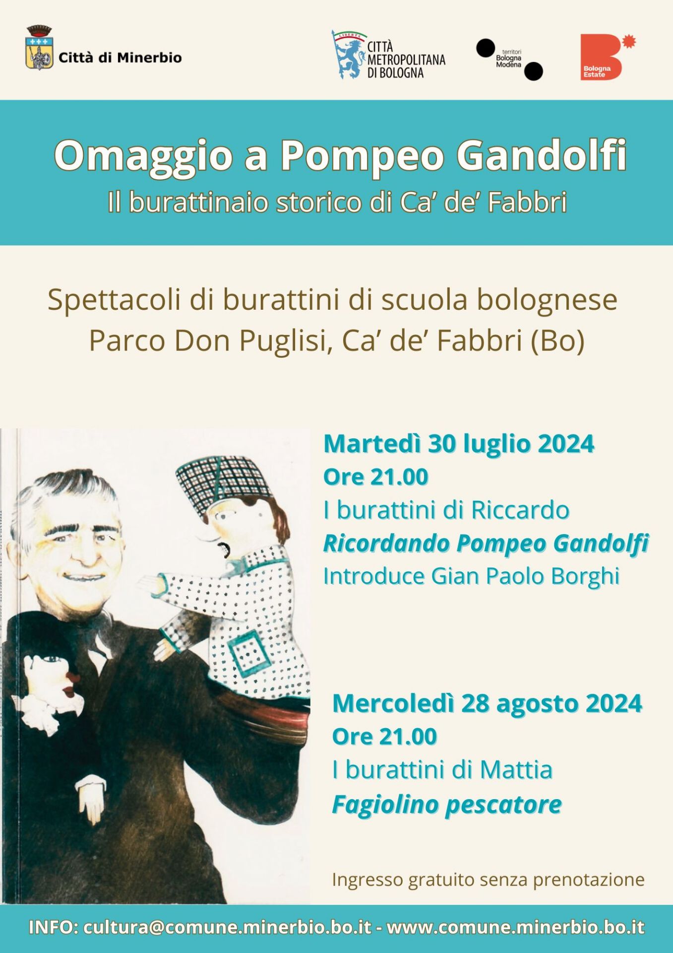 Martedì 30 luglio 2024 alle ore 21.00 al parco Don Puglisi a Ca' de' Fabbri, si terrà lo spettacolo di burattini di scuola bolognese "Ricordando Pompeo Gandolfi" di e con I burattini di Riccardo.