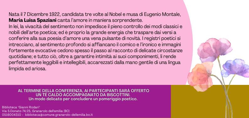 Sabato 17 dicembre, alle ore 17 in biblioteca "Rodari", Pierluigi Lenzi terrà la conferenza "I sei petali dei sensi", sull'amore nei versi di Maria Luisa Spaziani.