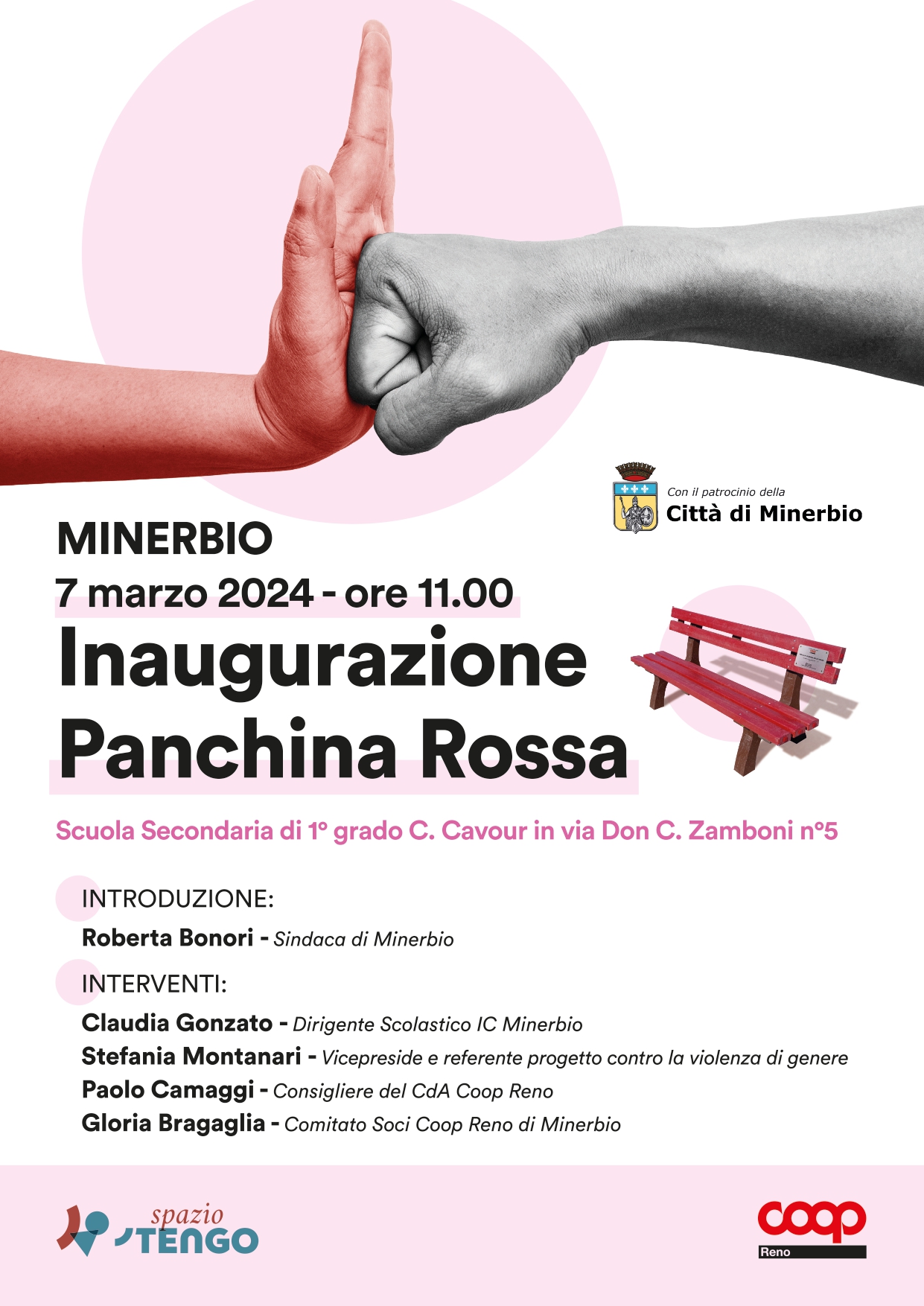 Nell'ambito delle iniziative per la Giornata Internazionale della donna, Giovedì 7 marzo - Ore 11.00 si terrà l'evento di inaugurazione di una panchina rossa presso la Scuola Secondaria di primo grado C. Cavour – via Don C. Zamboni, 5 Minerbio.