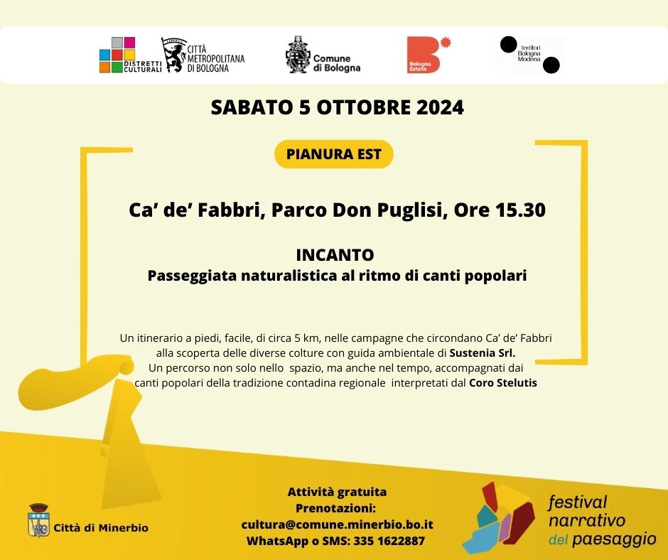 Sabato 5 ottobre 2024 alle ore 15.30, all'interno del Festival Narrativo del Paesaggio 2024 "Orizzonti che si incontrano", il Comune di Minerbio organizza: INCANTO. Passeggiata naturalistica di circa 5 km nelle campagne di Ca' de' Fabbri, al ritmo di canti popolari con il Coro Stelutis e con guida naturalistica Sustenia Srl.