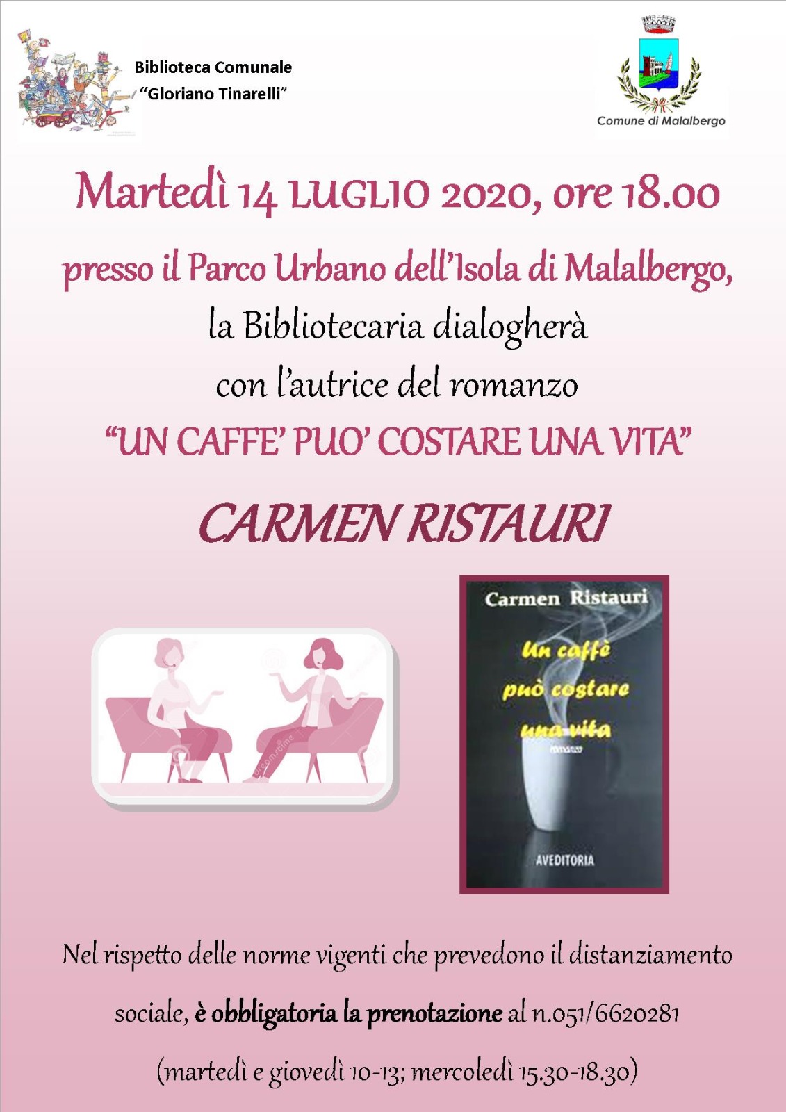 Martedì 14 luglio alle ore 18.00 presso il Parco Urbano dell'Isola di Malalbergo, la Bibliotecaria dialogherà con Carmen Ristauri, autrice del romanzo "Un caffè può costare una vita".