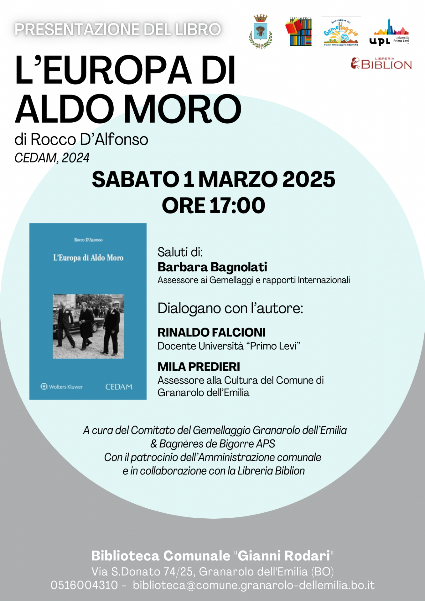Sabato 1 marzo 2025 alle ore 17:00, presso la Biblioteca Comunale "Gianni Rodari" di Granarolo dell’Emilia, si terrà la presentazione del libro L’Europa di Aldo Moro di Rocco D’Alfonso (CEDAM, 2024). L’evento, organizzato dal Comitato del Gemellaggio Granarolo dell’Emilia & Bagnères de Bigorre APS in collaborazione con l’Amministrazione comunale, offrirà un’occasione di approfondimento sulla visione europeista dello statista italiano.