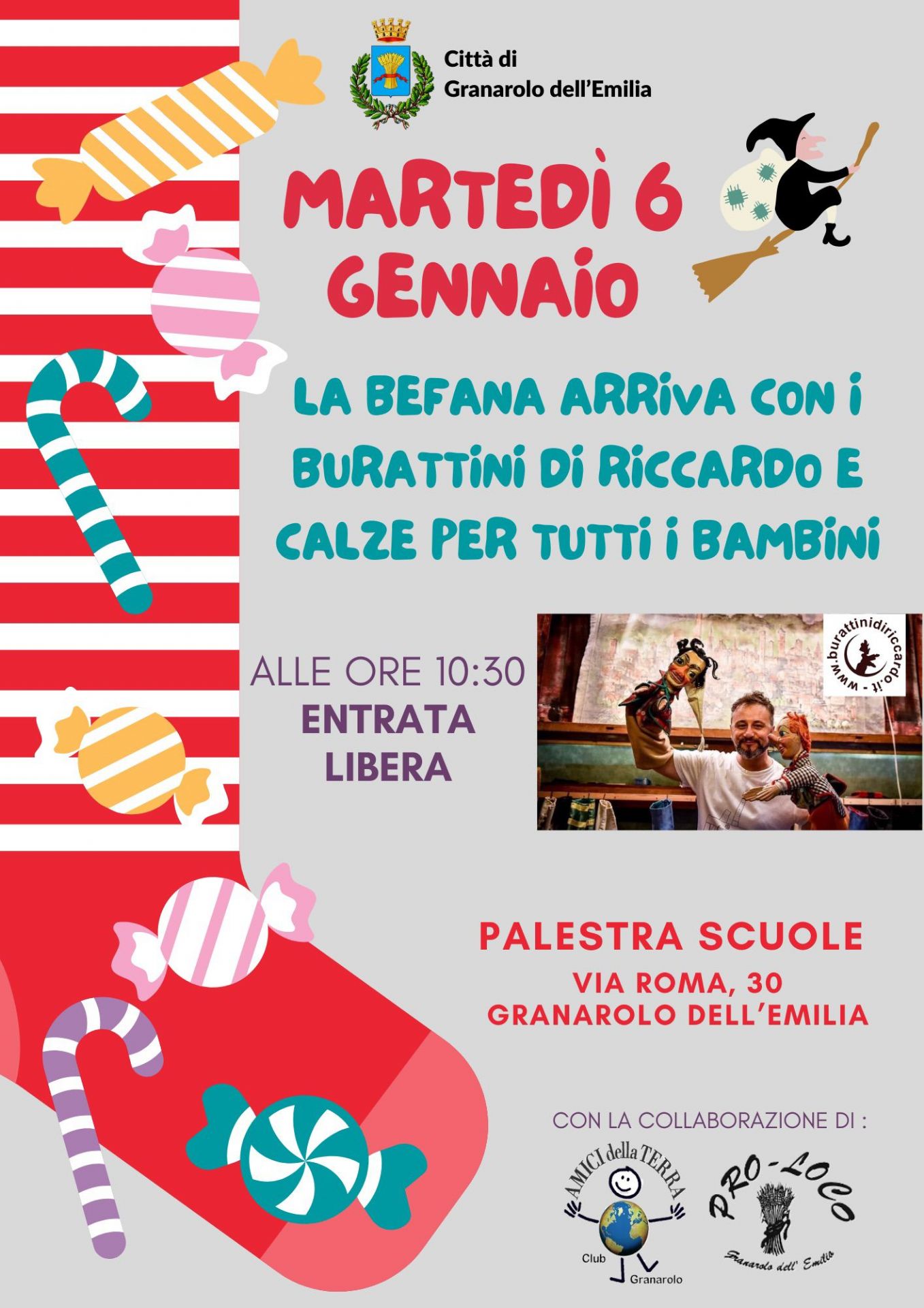 Alle ore 10.30, presso la palestra delle scuole di via Roma 30, la Befana farà il suo arrivo portando con sé uno spettacolo di burattini a cura di Riccardo e le immancabili calze per tutti i bambini.