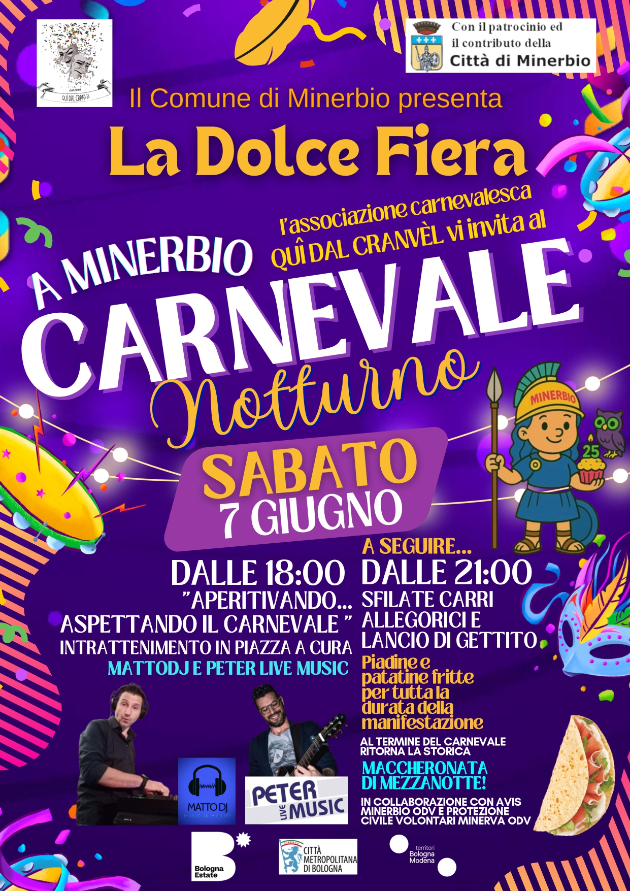 Sabato 07 giugno 2025, in occasione della 25a edizione della Dolce Fiera, come da tradizione, si terrà a Minerbio il CARNEVALE NOTTURNO a cura dell'associazione carnevalesca Quì dal Cranvèl.