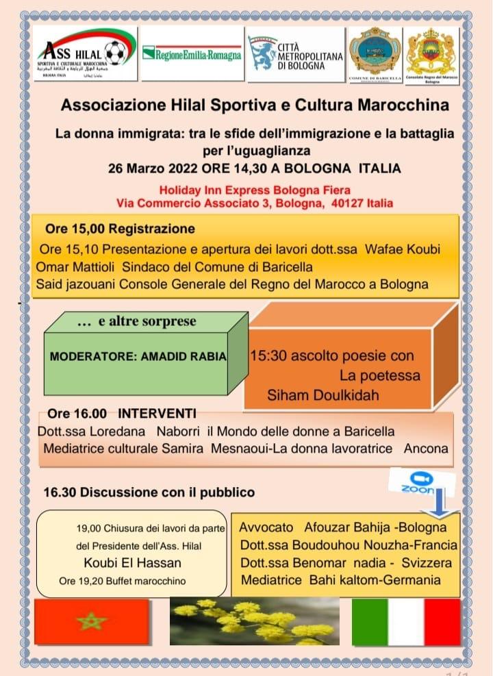 Nell'ambito di "Otto Marzo: Femminile plurale", la rassegna del Comune di Baricella dedicata alla Giornata Internazionale della Donna, il prossimo 26 Marzo 2022 si terrà un incontro dal titolo "La donna immigrata: tra le sfide dell'immigrazione e la battaglia per l'uguaglianza" organizzato dall'Associazione Hilal Sportiva e Cultura marocchina, con il patrocinio del Comune di Baricella.