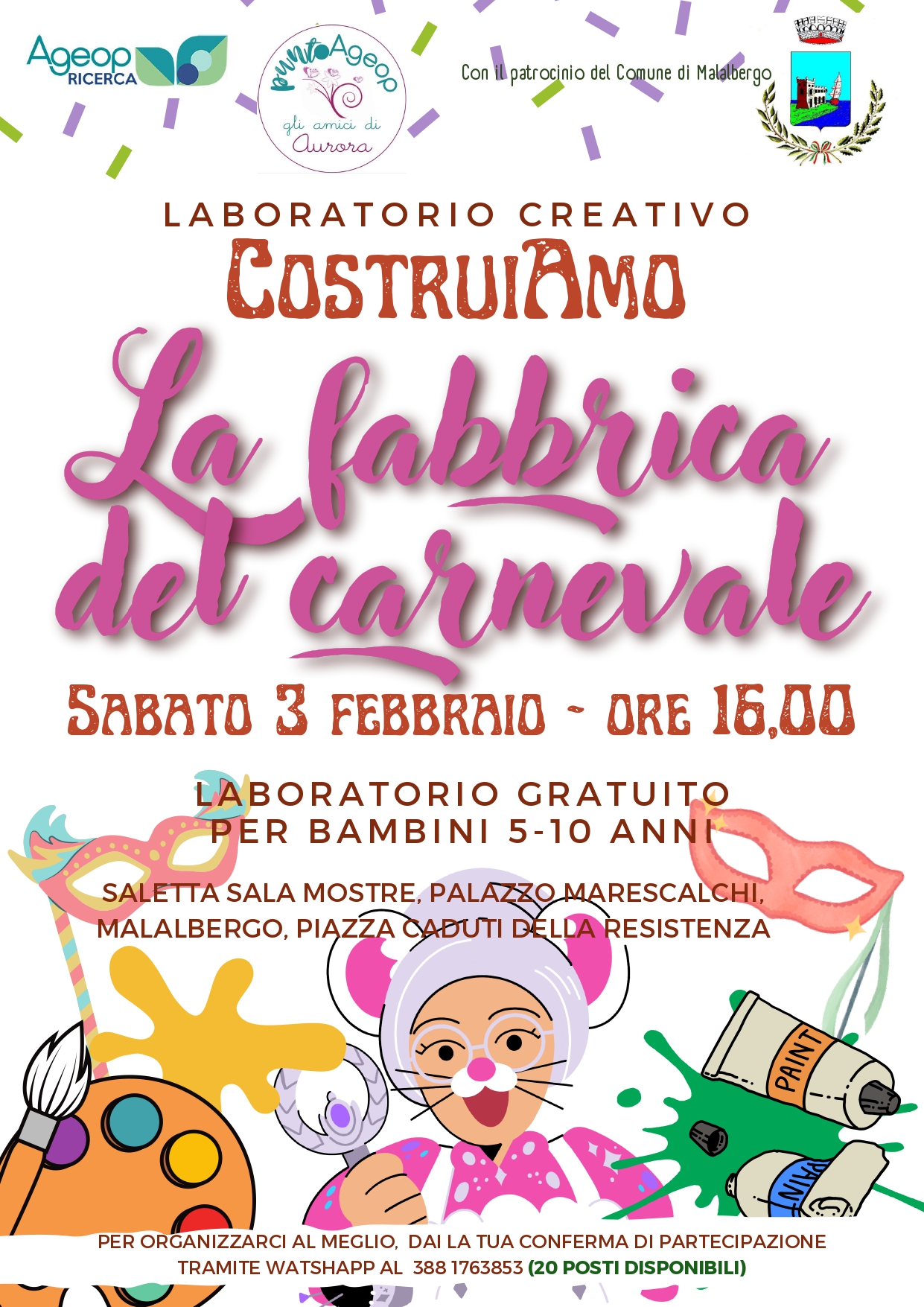 Sabato 3 Febbraio alle ore 16:00 nella saletta adiacente alla sala mostre di Palazzo Marescalchi si svolgerà il Laboratorio "La fabbrica del Carnevale" come da volantino in allegato.