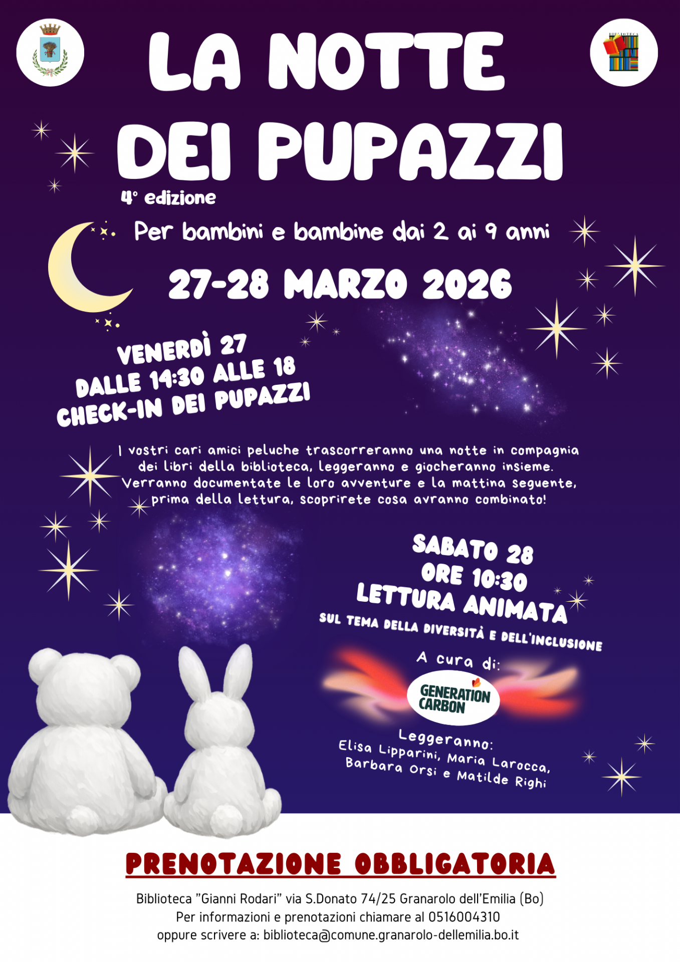 Sabato mattina 28 marzo, alle 10.30, le famiglie torneranno in biblioteca per ritrovare i pupazzi e scoprire insieme le loro avventure notturne. A seguire, si terrà una speciale lettura animata sul tema della multiculturalità, a cura delle lettrici di Generation Carbon.