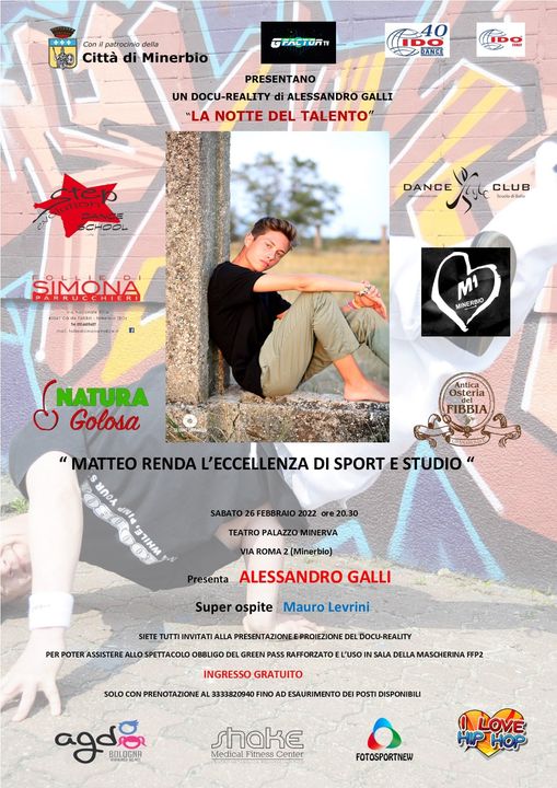 Sabato 26 febbraio alle ore 20.30 a Palazzo Minerva si svolgerà la serata "La notte del talento", ovvero la presentazione di un docu-reality di Alessandro Galli in cui sarà protagonista il giovanissimo concittadino Matteo Renda, eccellenza di sport e studio.
