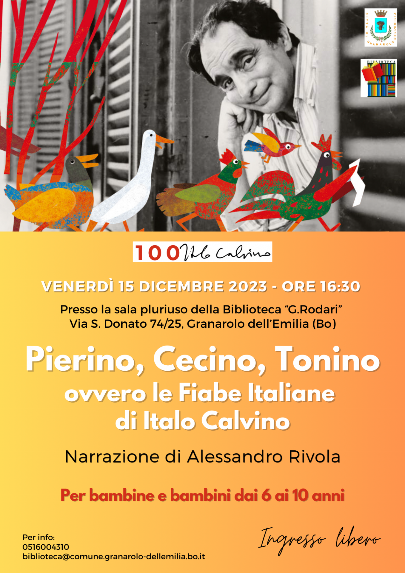 Venerdì 15 dicembre, alle ore 16.30 nella sala pluriuso della biblioteca, l’attore Alessandro Rivola svolgerà la narrazione “Pierino, Cecino e Tonino: le Fiabe italiane di Italo Calvino”, destinata a bambine e bambini dai 6 ai 10 anni. Ingresso libero.