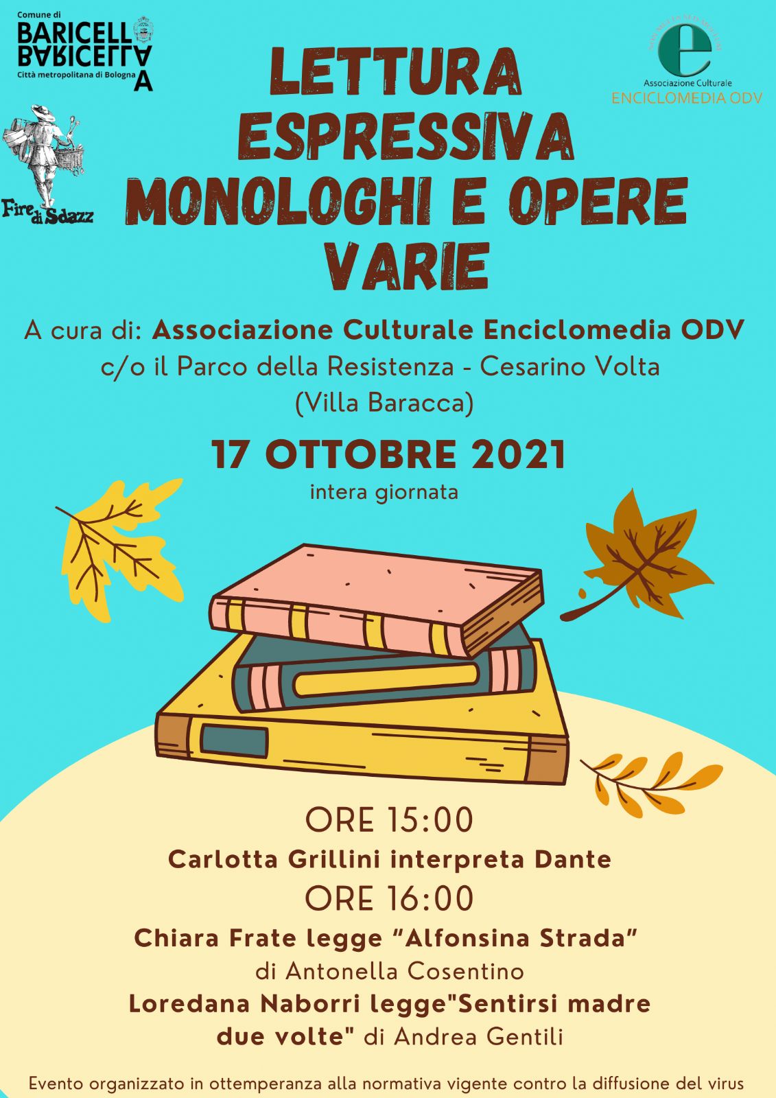 Nell'ambito della Fire di Sdazz 2021, il 17 Ottobre tra gli intrattenimenti della Fiera presso il Parco della Resistenza - Cesarino Volta (Villa Baracca) dalle ore 15:00 vi aspettano delle letture espressive di monologhi e opere varie, a cura dell'Associazione Culturale Enciclomedia ODV.