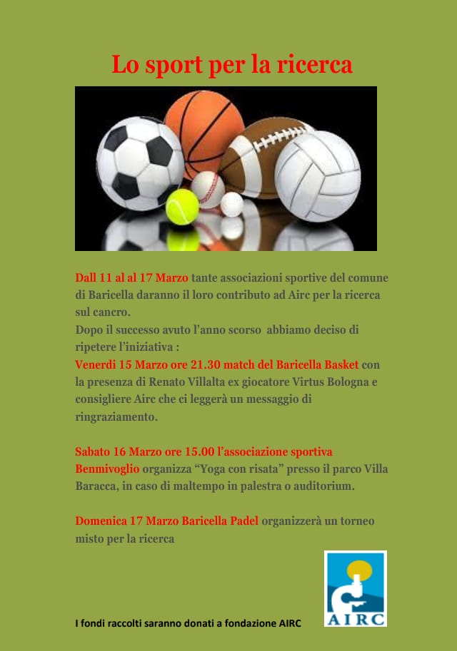A partire da Venerdì 15 Marzo, con il patrocinio del comune di Baricella, si svolgeranno una serie di iniziative sportive il cui ricavato sarà devoluto alla Fondazione AIRC per la ricerca sul cancro.