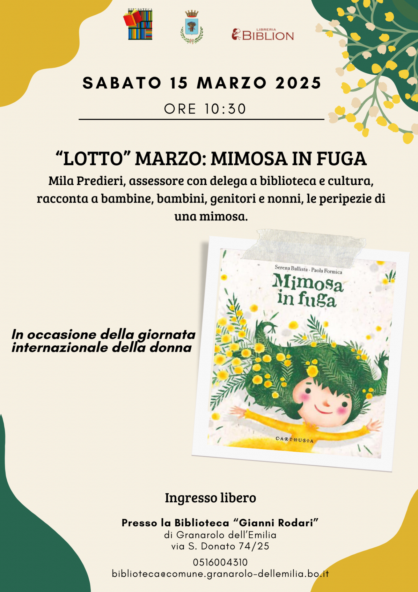 Sabato 15 marzo 2025 alle ore 10:30, l’assessora alla Cultura e alla Biblioteca, Mila Predieri, leggerà Mimosa in fuga, una storia avvincente che racconta le peripezie di una mimosa. Un’occasione per riflettere, attraverso la lettura, sul significato dell’8 marzo e sull’importanza della parità di genere.