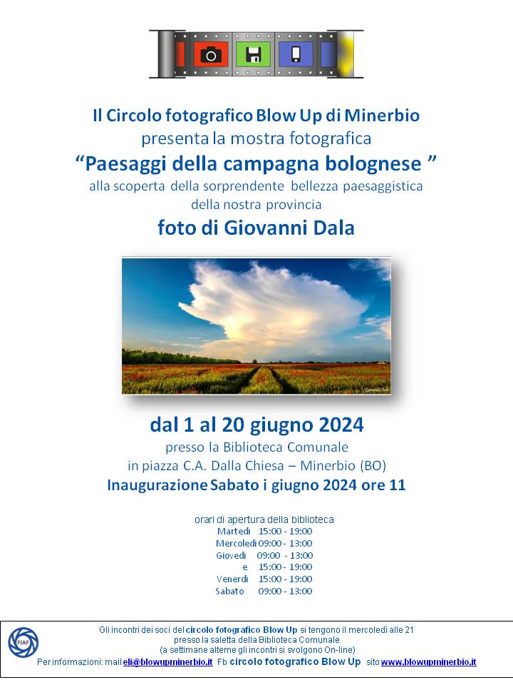 Sabato 1 giugno 2024 alle ore 11.00 nella Biblioteca Comunale di Minerbio si terrà l'inaugurazione della mostra fotografica "Paesaggi della campagna bolognese. Alla scoperta della sorprendente bellezza paesaggistica della nostra provincia" a cura del Circolo fotografico Blow up.