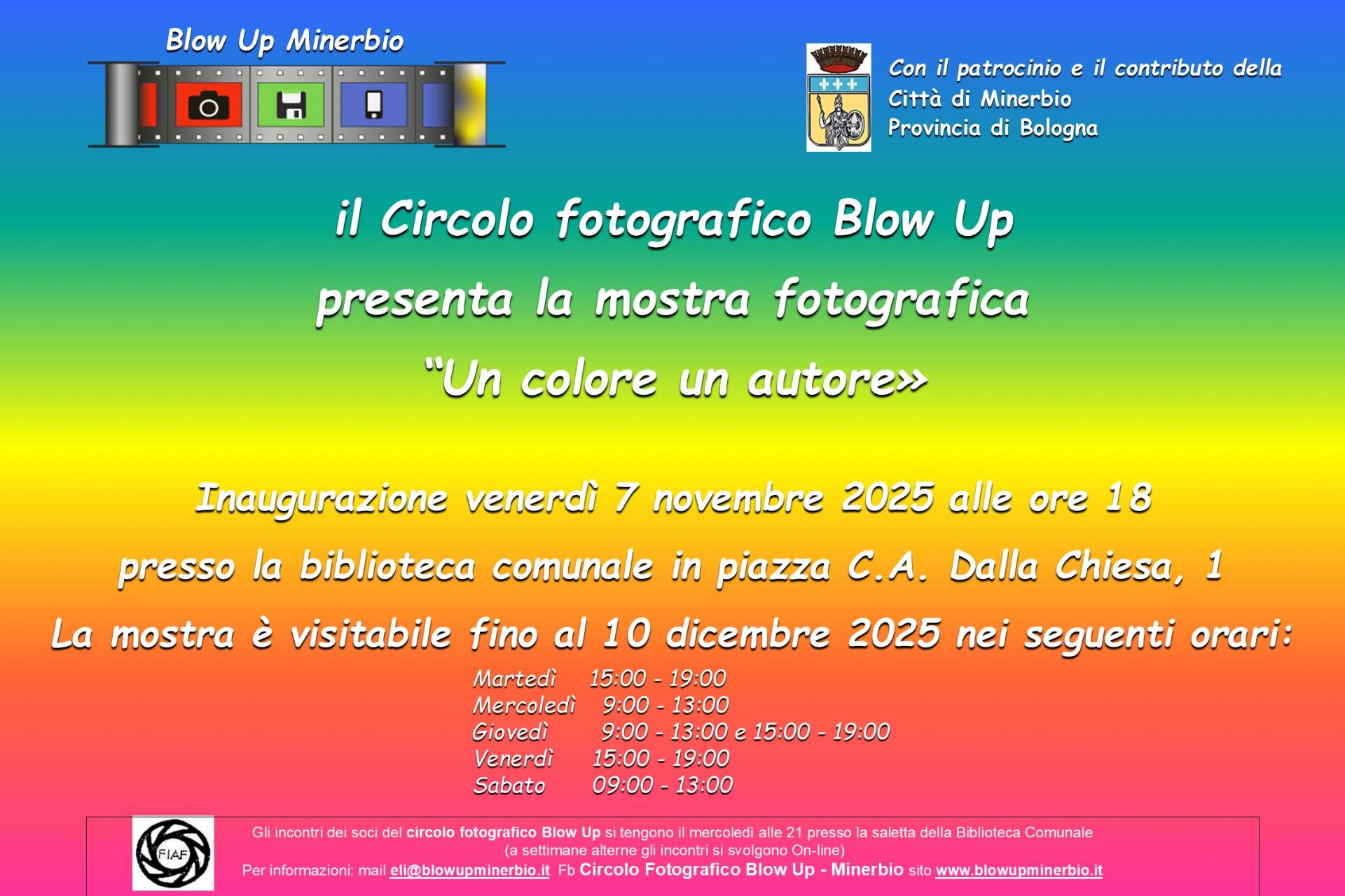 Venerdì 7 novembre 2025, alle ore 18:00, presso la Biblioteca Comunale di Minerbio, il circolo fotografico Blow Up inaugurerà la mostra fotografica "Un colore, un autore", realizzata con il patrocinio ed il sostegno del Comune di Minerbio.