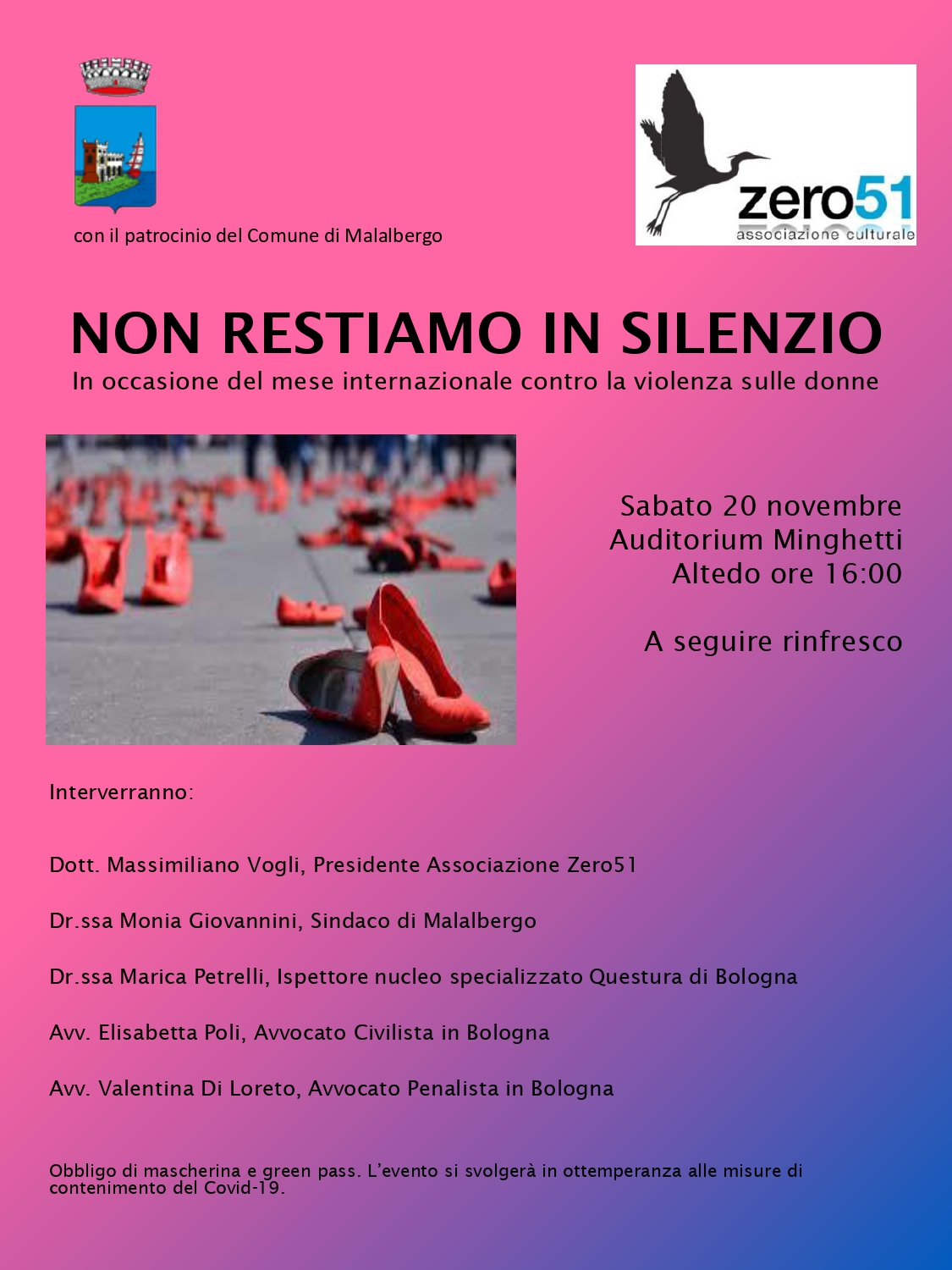 “NON RESTIAMO IN SILENZIO” si svolgerà alle ore 16:00 di Sabato 20 Novembre 2021 presso l’Auditorium Comunale E. Minghetti - Altedo, in occasione del mese internazionale contro la violenza sulle donne.