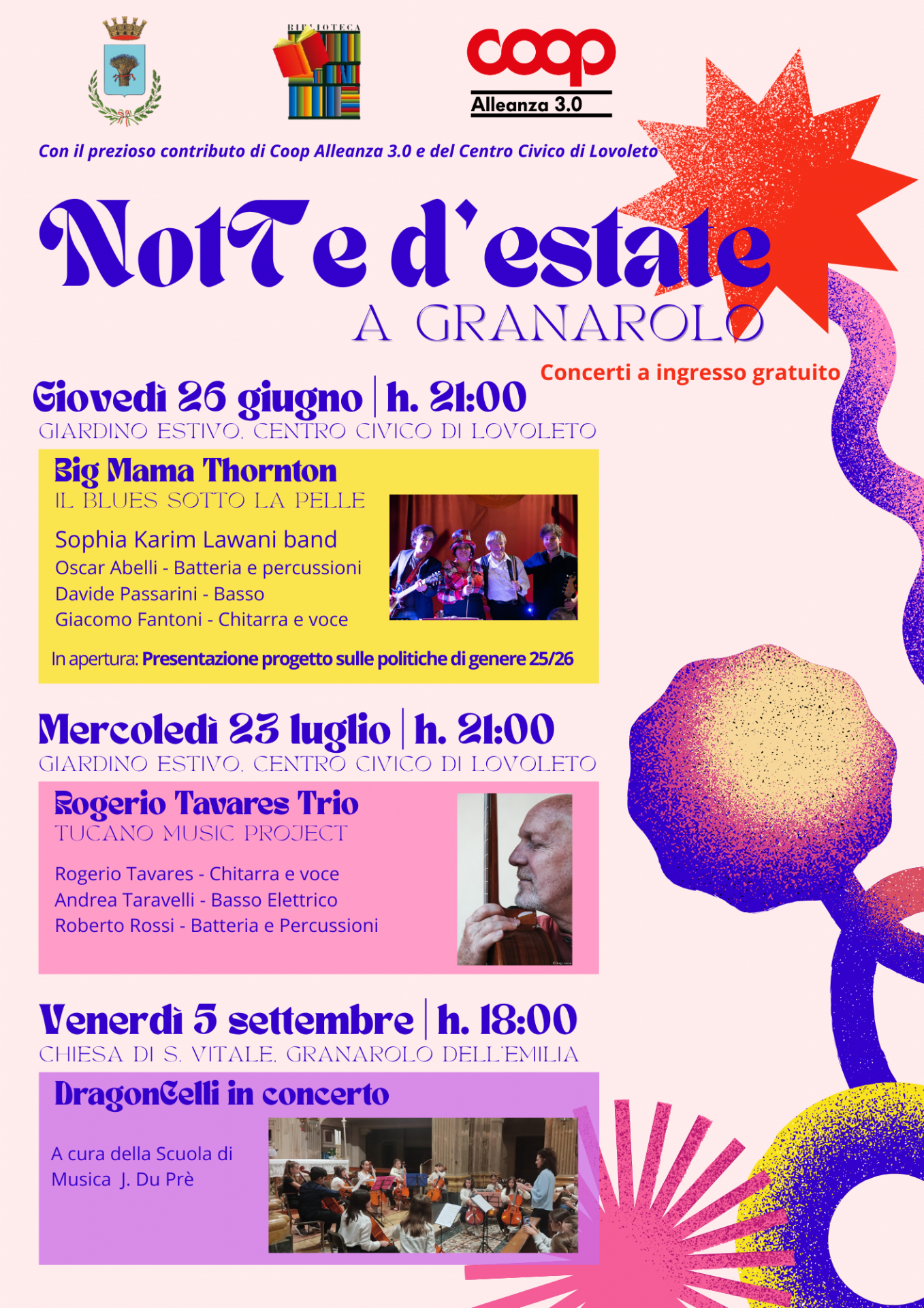 Il Comune di Granarolo dell'Emilia, con il prezioso contributo di Coop Alleanza 3.0 e del Centro Civico di Lovoleto, presenta la rassegna "NotTe d'Estate", una serie di concerti gratuiti che animeranno l'estate granarolese con musica di qualità e momenti di aggregazione per tutta la comunità. Un'occasione per riscoprire il piacere della musica dal vivo in contesti suggestivi del nostro territorio, dal giardino del Centro civico di Lovoleto estivo alla spiritualità della chiesa di San Vitale.
