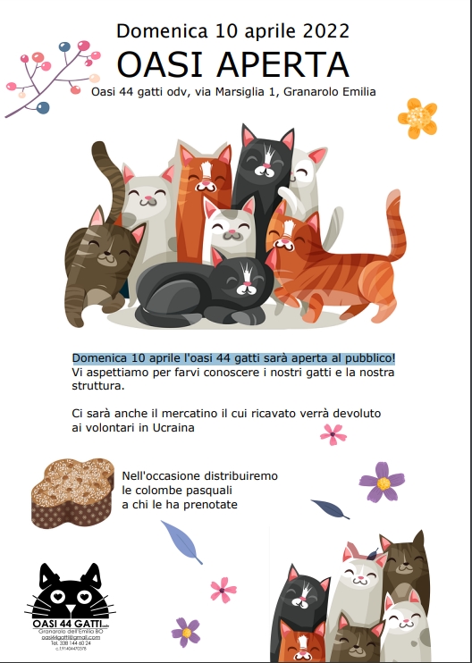 Domenica 10 aprile l'Oasi 44 gatti, in via Marsiglia 1, sarà aperta al pubblico. I volontari dell’oasi felina aspettano i visitatori per far conoscere i gatti ospiti e nostra struttura. Ci sarà anche il mercatino il cui ricavato verrà devoluto alle associazioni che si occupano di animali salvati dalle zone di guerra in Ucraina, tra queste anche associazioni italiane che sono andate sul posto a prendere animali per portarli in salvo. Nell'occasione verranno distribuite le colombe pasquali a chi le ha prenotate.