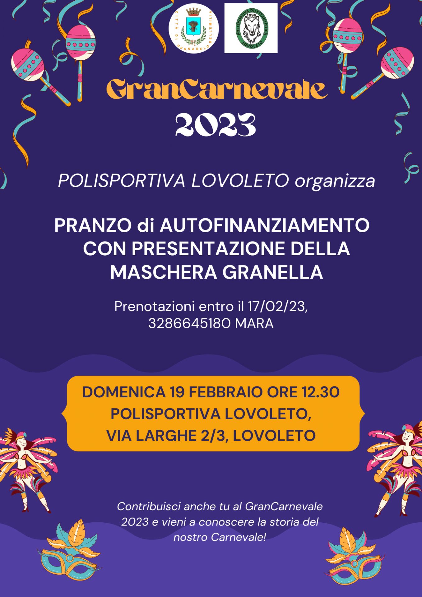 La Polisportiva di Lovoleto organizza domenica 19 febbraio, alle ore 12.30, un pranzo in cui sarà presentata la maschera di Granella, che sarà protagonista dei futuri carnevali granarolesi. Il pranzo si tiene presso il centro civico di Lovoleto (via Larghe 2/3).