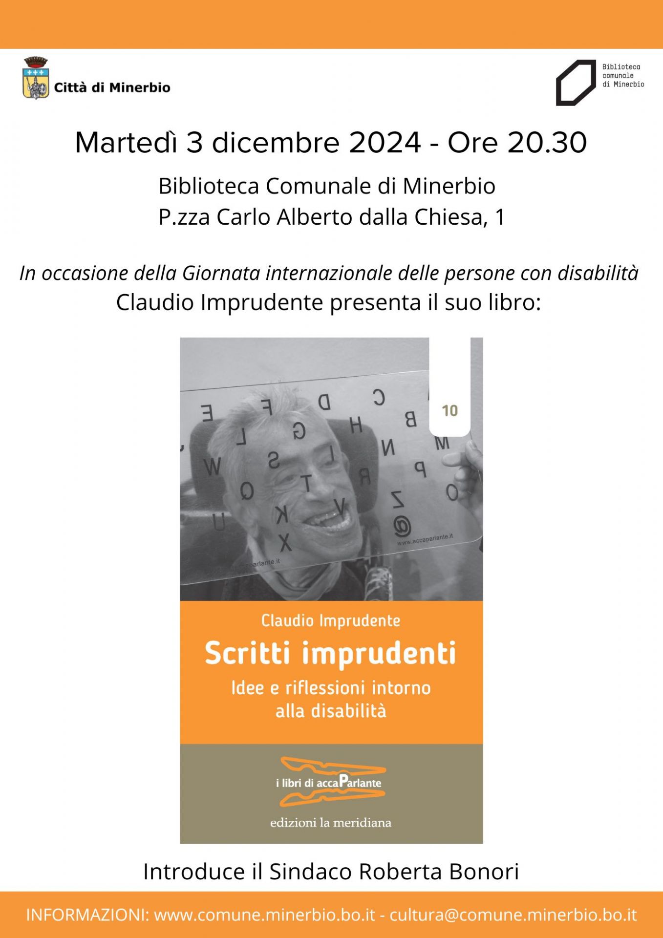 In occasione della Giornata internazionale delle persone con disabilità, martedì 3 dicembre 2024 alle ore 20.30 presso la Biblioteca Comunale Prometeo di Minerbio, Claudio Imprudente presenta il suo libro "Scritti imprudenti. Idee e riflessioni intorno alla disabilità". Edizioni La Meridiana.