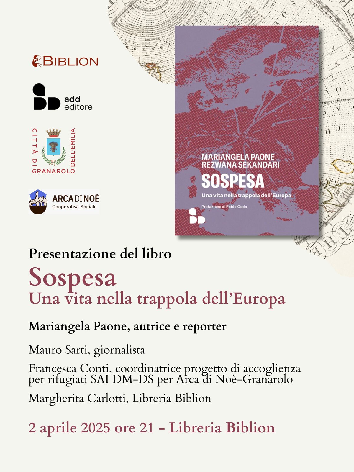 La Libreria Biblion, con il patrocinio del Comune di Granarolo dell'Emilia, ospita l'incontro per la presentazione del libro "Sospesa. Una vita nella trappola dell’Europa", di Mariangela Paone e Rezwana Sekandari. L’evento si tiene il 2 aprile 2025 alle ore 21 presso la Libreria.