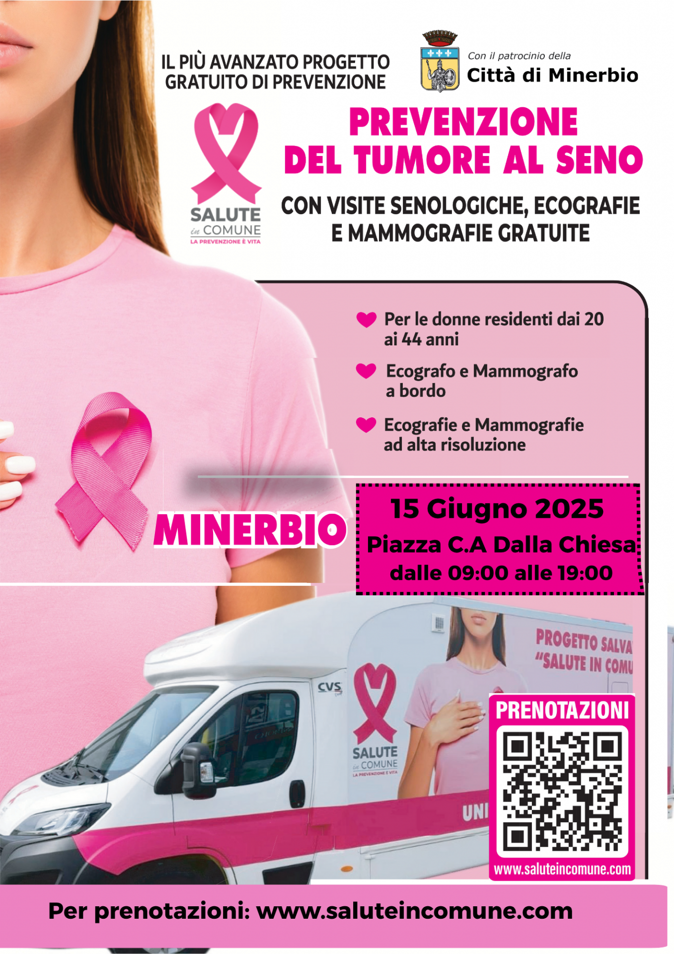 Il Comune di Minerbio ha patrocinato l'iniziativa "Salute in Comune", un progetto di sanità solidale, che prevede una clinica mobile sul territorio e uno staff di medici specializzati per effettuare visite ed esami diagnostici gratuiti dedicati alla prevenzione del tumore al seno.