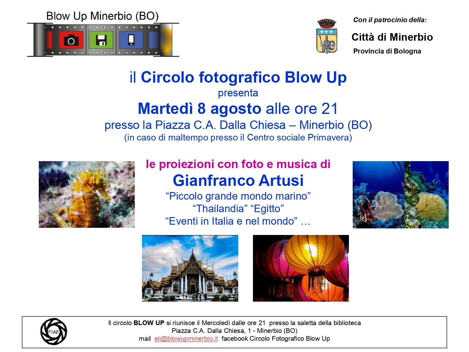Martedì 8 agosto 2023 il Circolo fotografico Blow up con il patrocinio del Comune di Minerbio organizza in Piazza C.A. Dalla Chiesa a Minerbio alle ore ore 21,00 Proiezioni con foto e musica di Gianfranco Artusi.