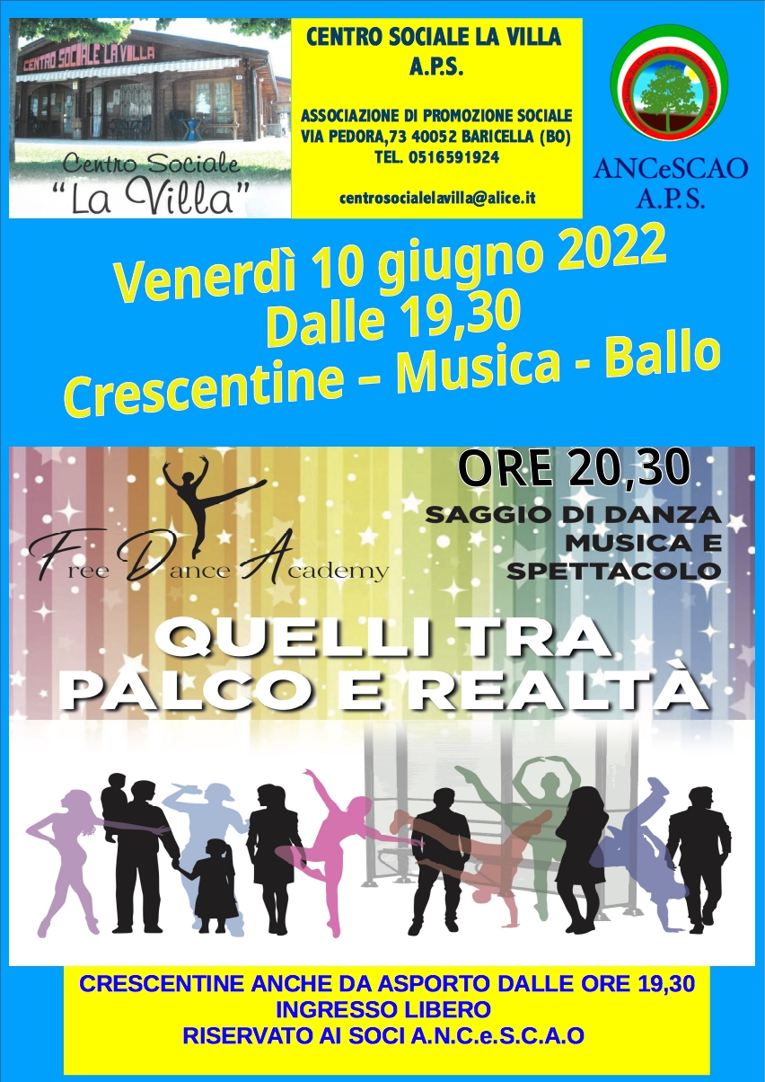 Il Centro Sociale “LA VILLA” vi aspetta con il Saggio di danza e spettacolo di Free Dance Academy ASD, organizzato in la collaborazione di La Sfera Invisibile e Centro di Formazione integrata Suono Corpo Voce “SANTA CATERINA DE’ VIGRI”.