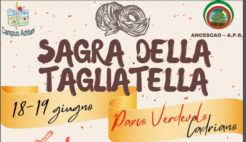Tagliatelle per tutti i gusti e con tanti condimenti attendono i visitatori della Sagra della Tagliatella, sabato 18 e domenica 19 giugno al Parco Verdevolo di Cadriano. La festa è organizzata da Campus Adriani.