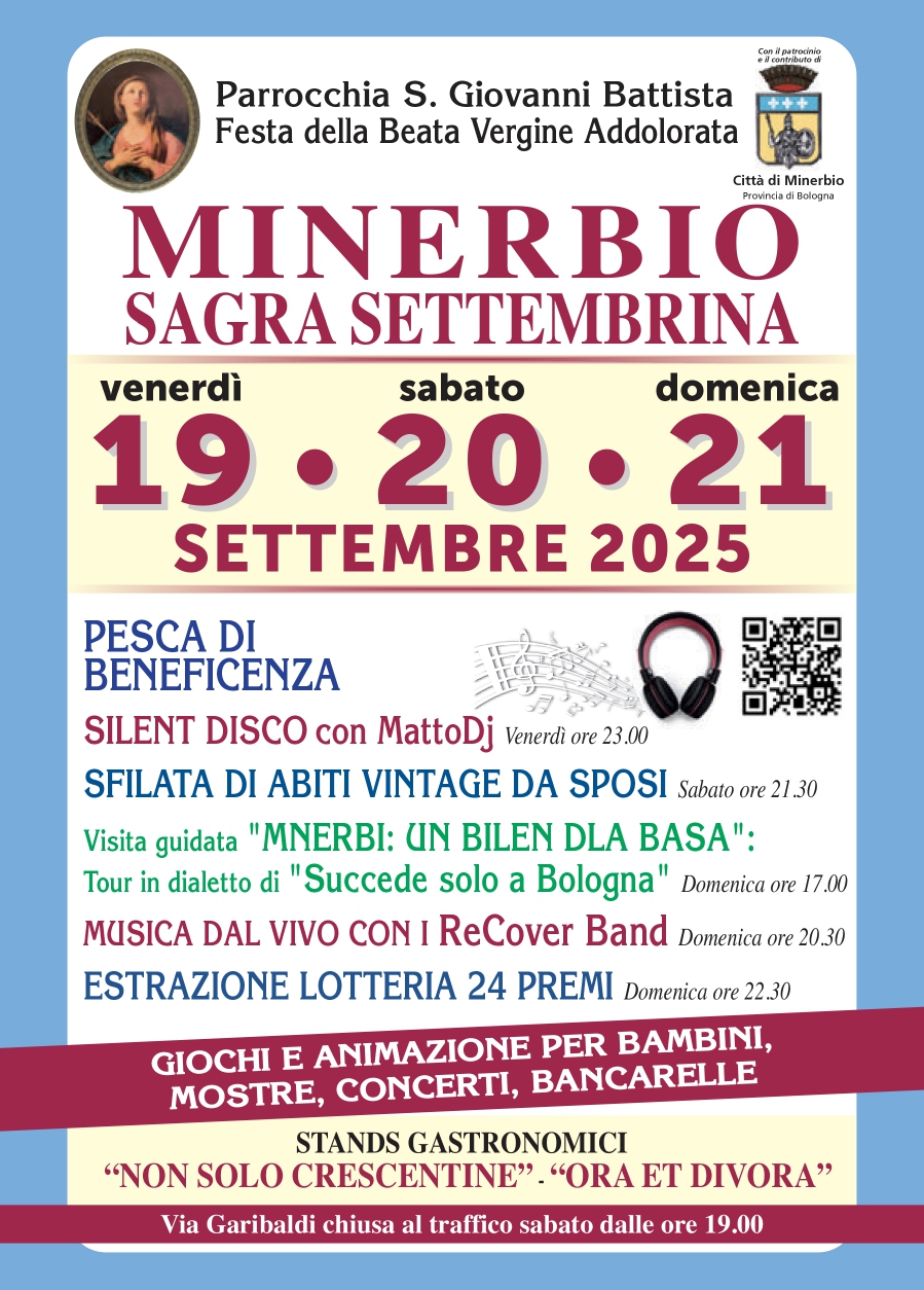 In occasione della Festa della Beata Vergine Addolorata, la Parrocchia San Giovanni Battista di Minerbio è lieta di invitarvi alla SAGRA SETTEMBRINA che si terrà nei giorni di venerdì 19, sabato, 20 e domenica 21 settembre 2025!
