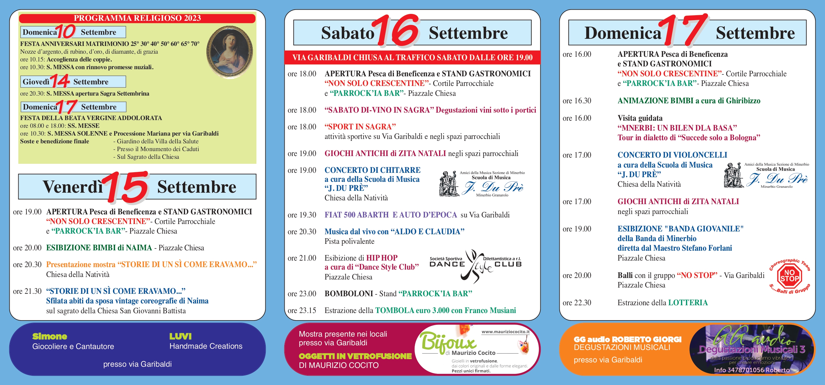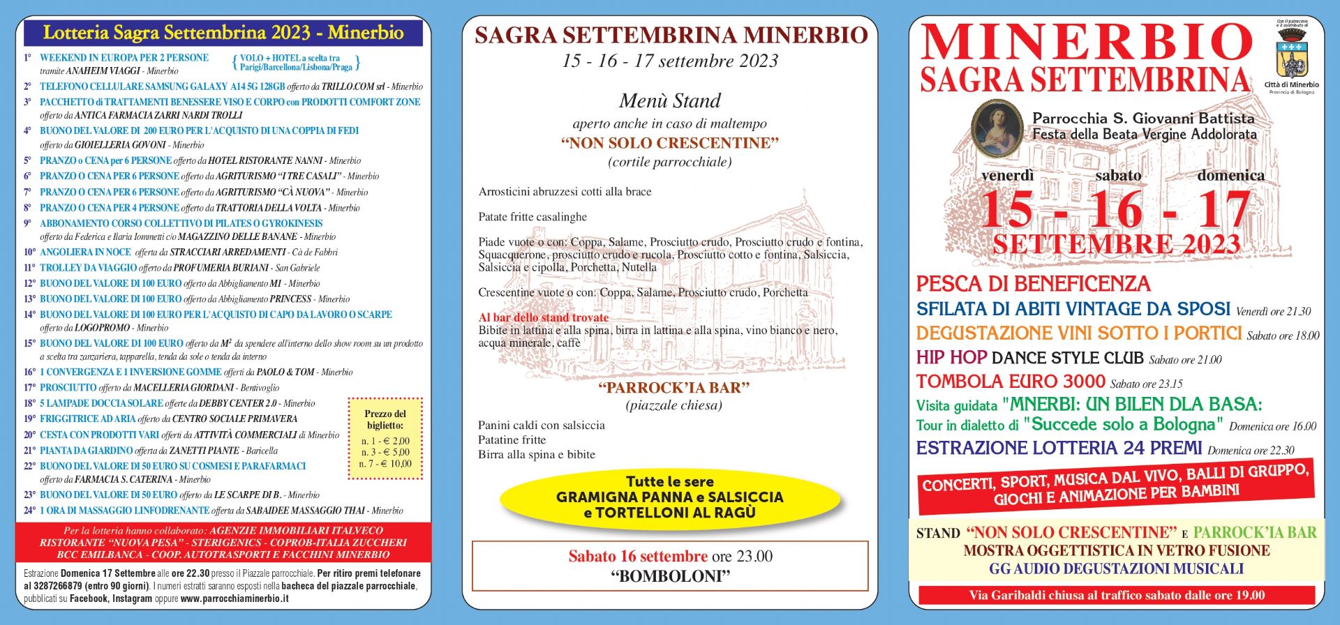 La Parrocchia San Giovanni Battista di Minerbio, in occasione della Festa della Beata Vergine Addolorata, organizza venerdì 15, sabato 16 e domenica 17 settembre 2023 la SAGRA SETTEMBRINA.