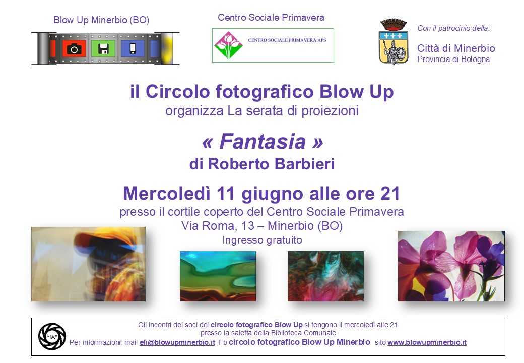 Il Circolo Fotografico Blow Up invita la cittadinanza alla serata di proiezioni fotografiche "Fantasia" di Roberto Barbieri, un evento dedicato all'arte dell'immagine e alla creatività visiva.