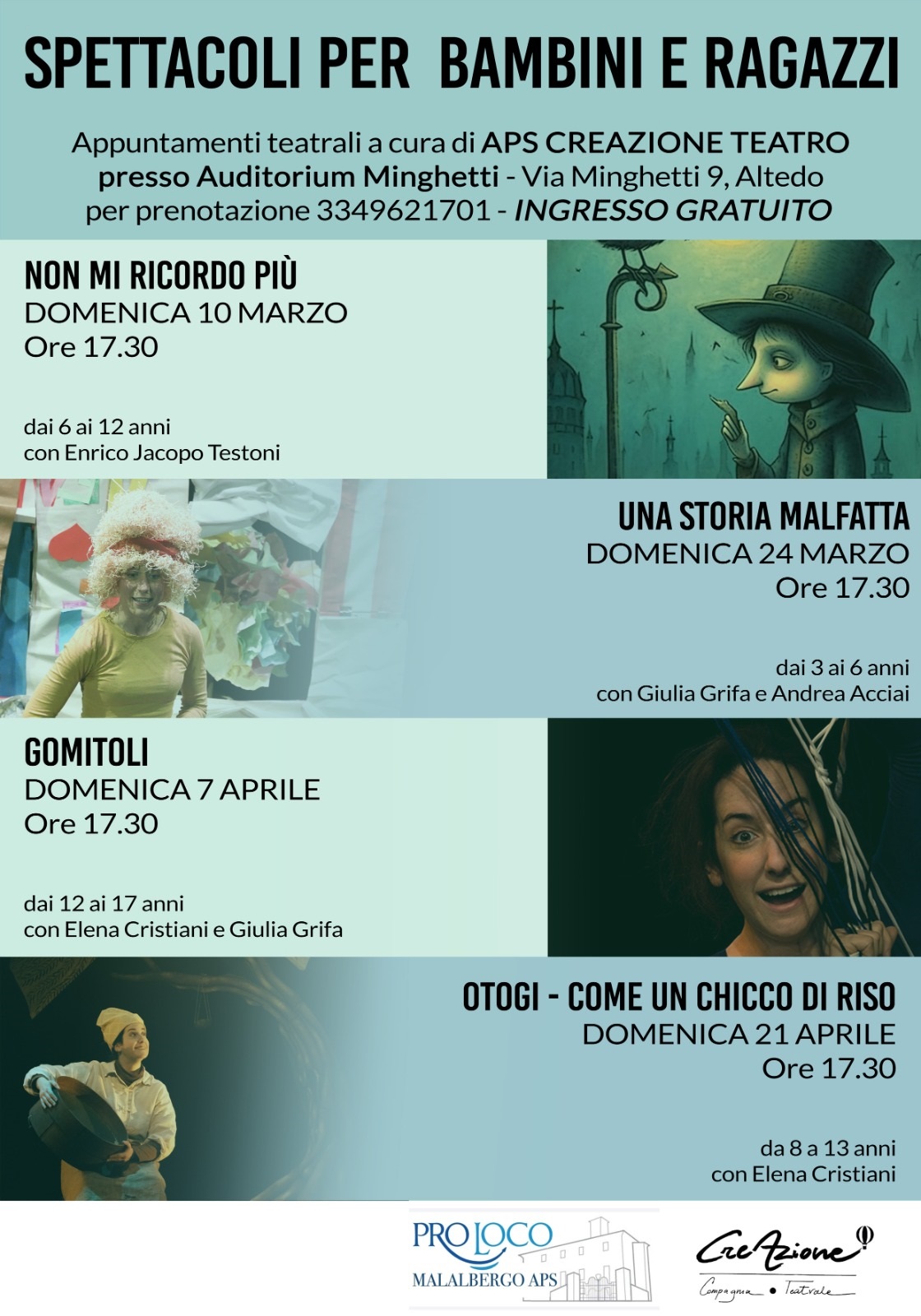 In allegato il volantino con la rassegna di spettacoli a cura di Creazione Teatro di Marzo e Aprile.
