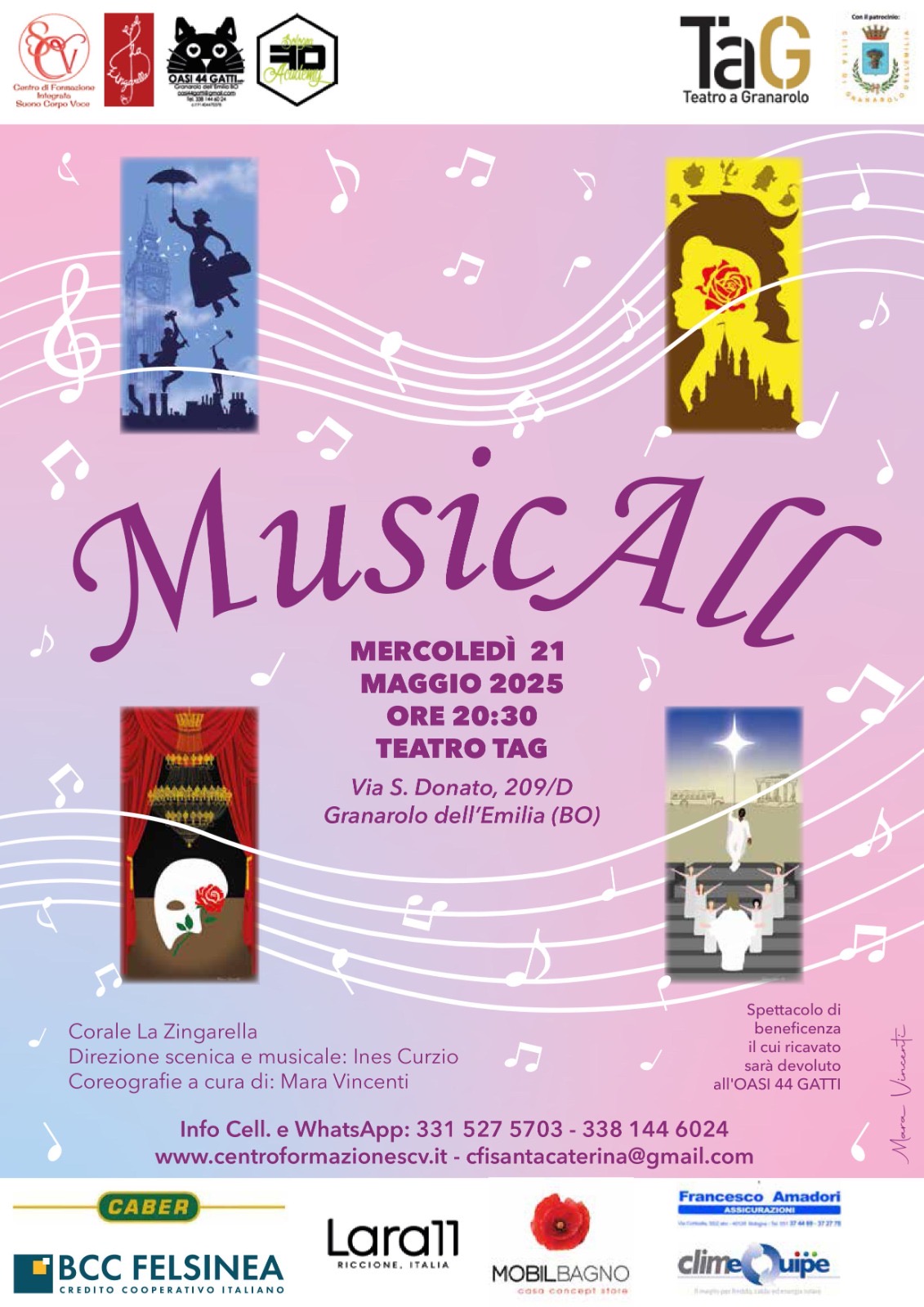 Mercoledì 21 maggio 2025, alle ore 20:30, appuntamento con “MusicAll” al Teatro TAG di Granarolo dell’Emilia (via S. Donato, 209/D). Lo spettacolo, diretto da Ines Curzio con coreografie di Mara Vincenti e la partecipazione della Corale La Zingarella, propone un viaggio tra i più celebri musical. L’evento è a scopo benefico: il ricavato sarà devoluto all’Oasi 44 Gatti.